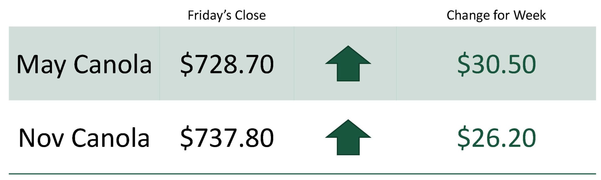 For the week, May canola was at $728.70 up $30.50 while Nov canola was at $737.80 up $26.20.