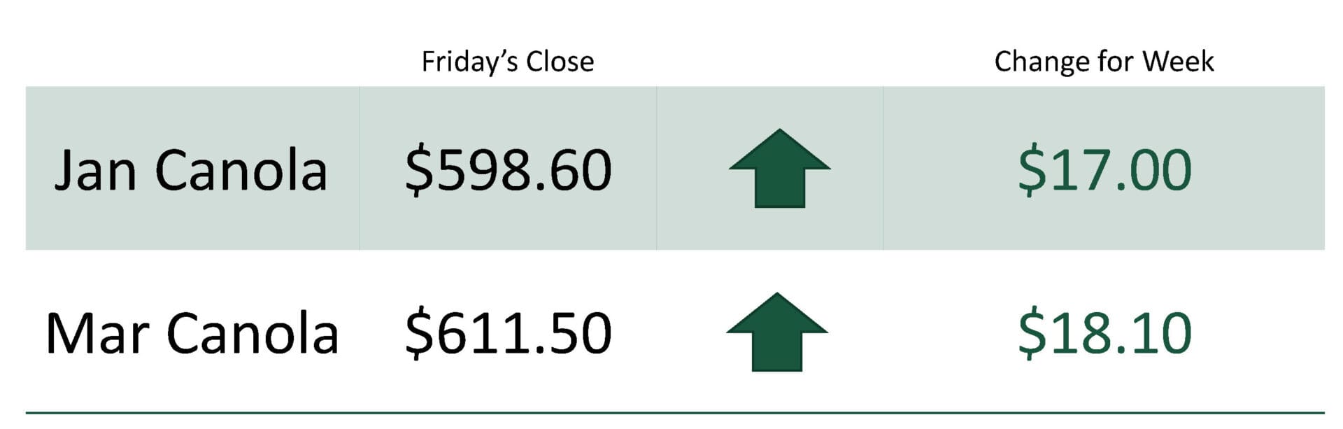 For the week, January canola was at $598.60 up $17.00 while March canola was at $611.50 up $18.10.