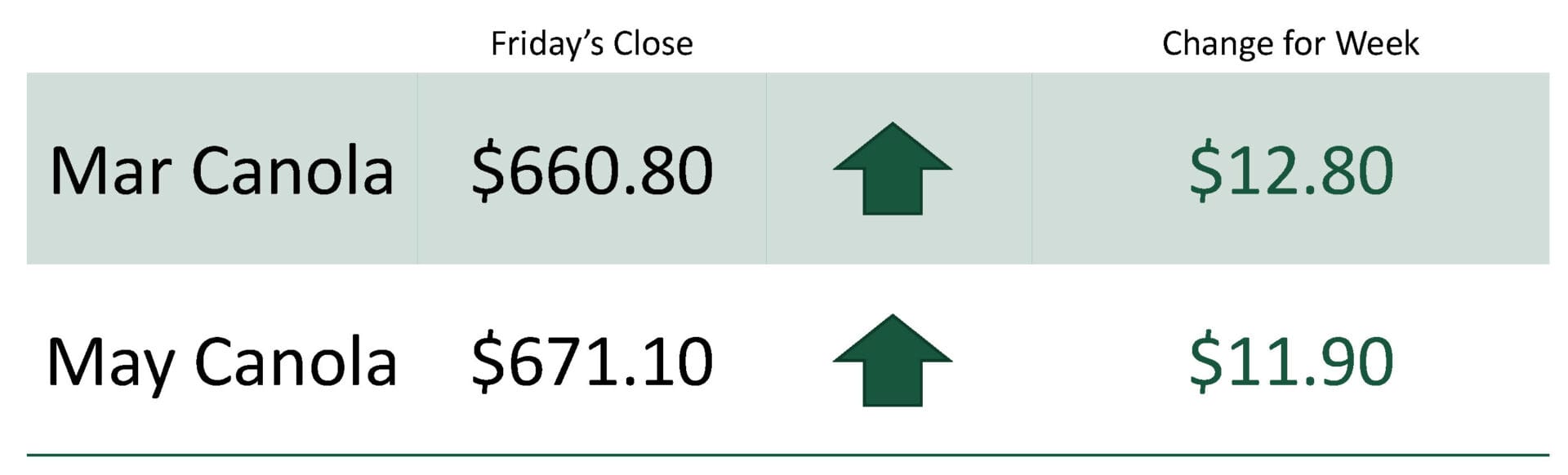 For the week, March canola was at $660.80 up $12.80 while May canola was at $671.10 up $11.90.