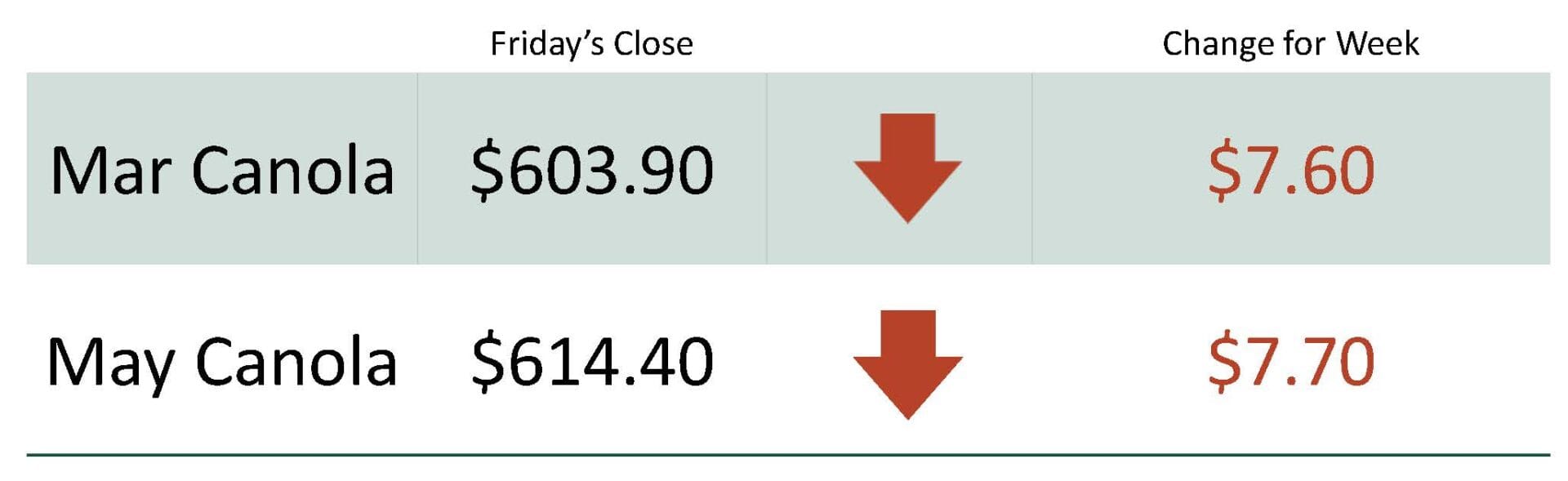 For the week, March canola was at $603.90 down $7.60 while May canola was at $614.40 down $7.70.