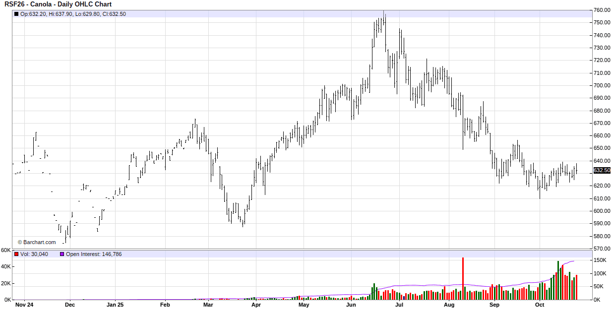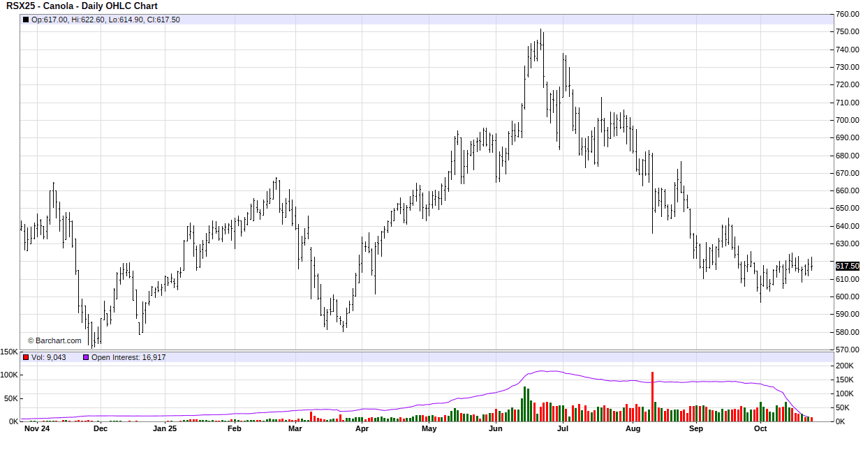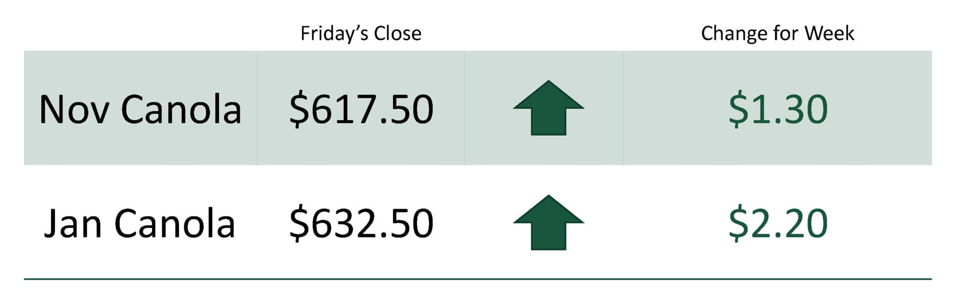 For the week, November canola was at $617.50 up $1.30 and January canola was at $632.50 up $2.20.