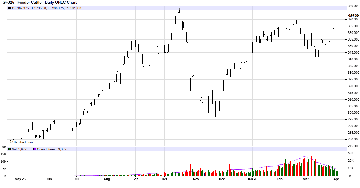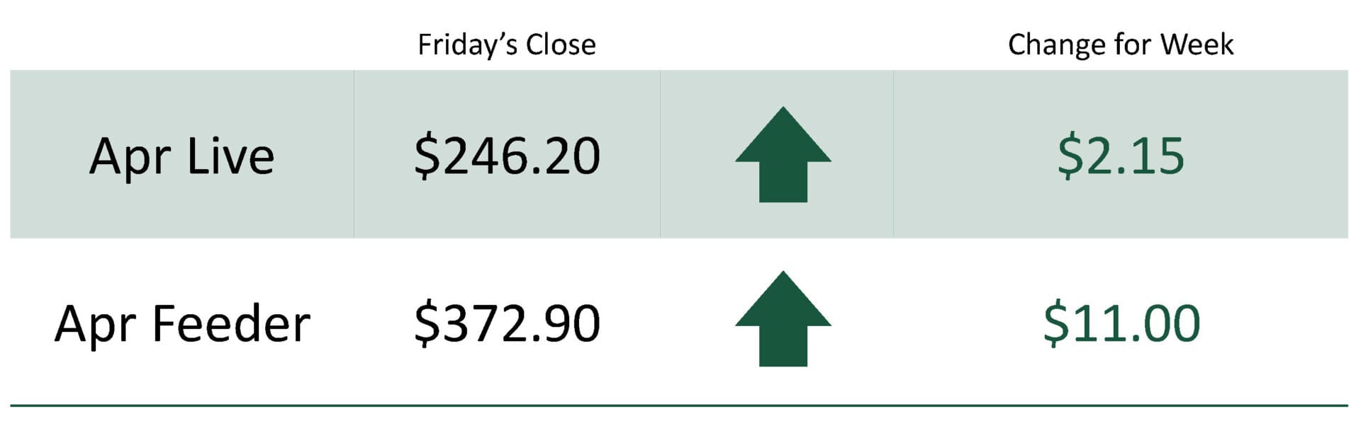 For the week, April live cattle closed at $246.20 up $7.50. April feeder cattle closed at $372.90 up $11.00.