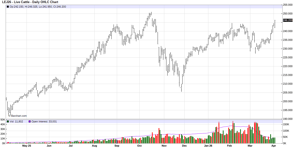 Buying continued to drive the cattle markets to wrap up the week, ending Wednesday as live cattle spent the session on the higher side and closed with solid gains. Feeder cattle climbed higher for the first half of the session, trimmed the gains a bit late in the session but still closed with good gains. Support came from the gains in the stock market, sharply lower crude oil market, and lower corn market. But gains were limited by slow cash trade this week. The JBS strike in Greeley, CO, is now in its third week. JBS has shifted some production to other plants but has not been able to fully offset the lost production. The World Agricultural Outlook Board estimated that as of March 24, 57% of US cattle were in areas experiencing drought vs. 45% at this time last year. 52% of hay acreage is in drought areas vs. 40% at the same time last year.