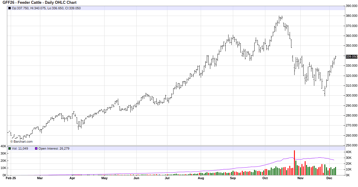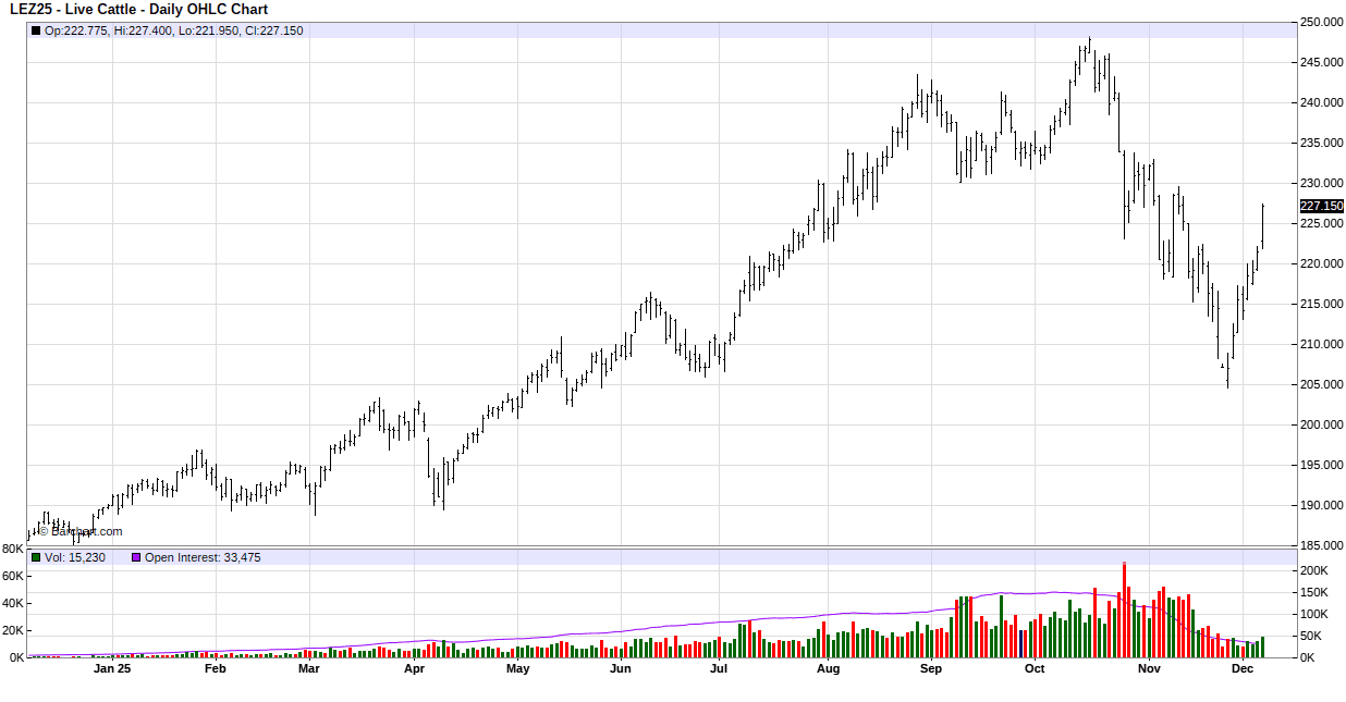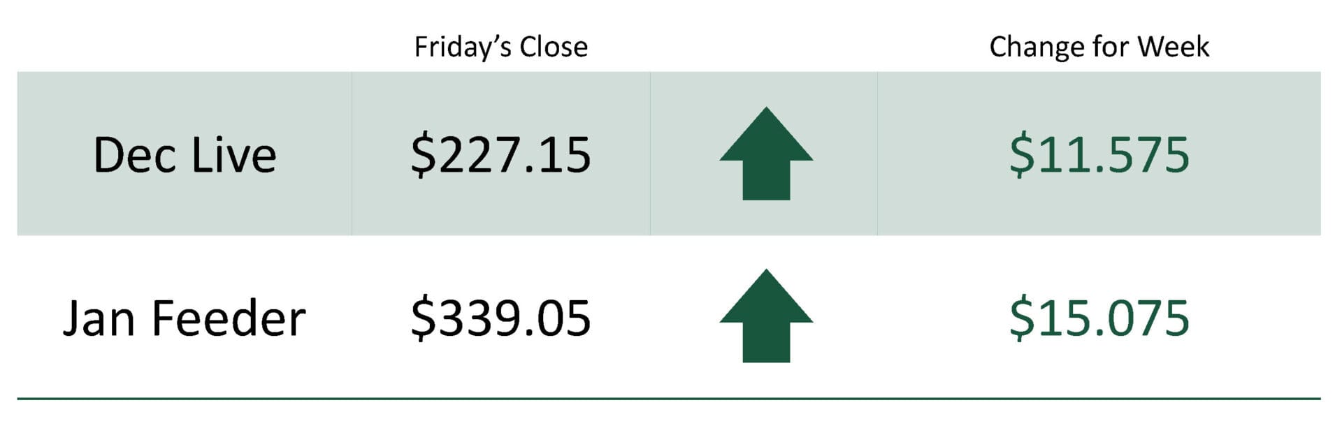 For the week, Dec live cattle closed at $227.15 up $11.575. Jan feeder cattle closed at $339.05 up $15.075.