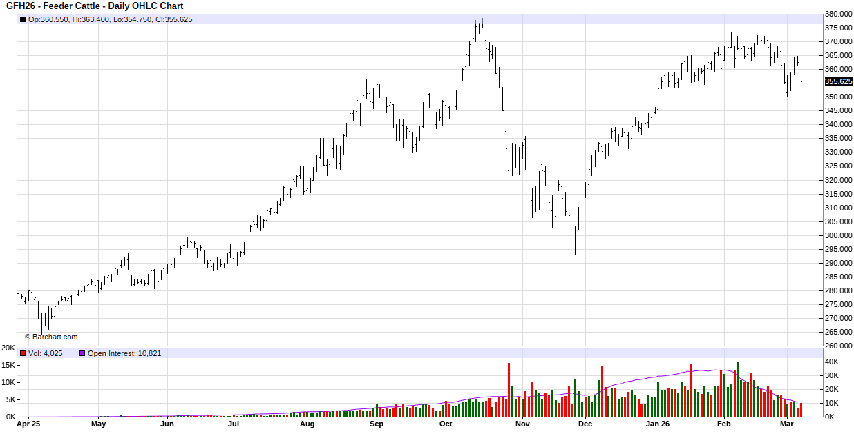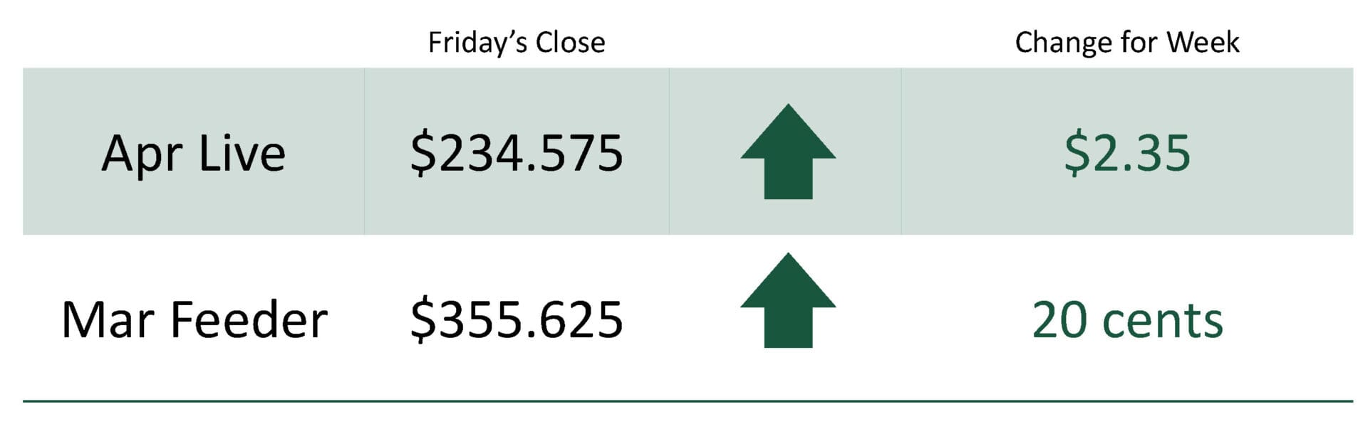 For the week, April live cattle closed at $234.575 up $2.35. March feeder cattle closed at $355.625 up 20 cents.