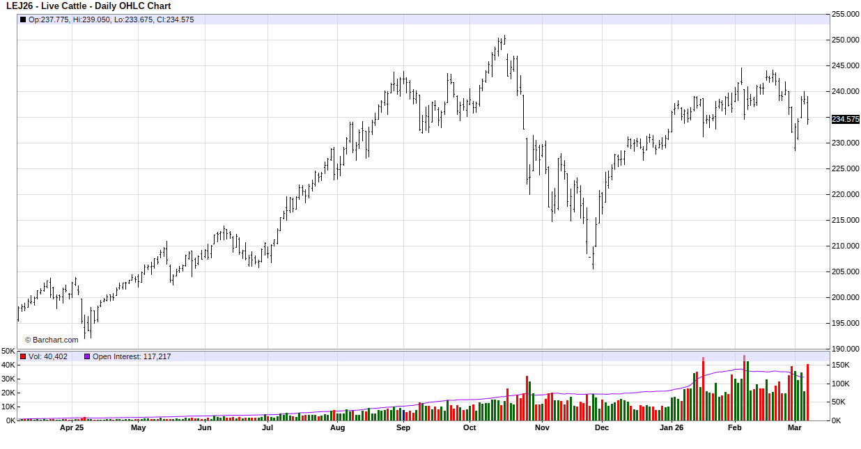 Live cattle traded with gains throughout the week while feeder cattle flipped flopped back and forth starting the week with gains and extending gains mid-week only to see selling pressure trim gains Tuesday and Thursday. Although this week is likely going to end with cattle posting a higher weekly close, the cattle just look tired. To add to that, the war in Iran is pushing crude oil prices higher and putting pressure on the stock market, both resulting in a decrease in disposable income for the consumer to spend on higher price beef. The net result is consumers switching to lower cost protein sources and a decrease in dining out.