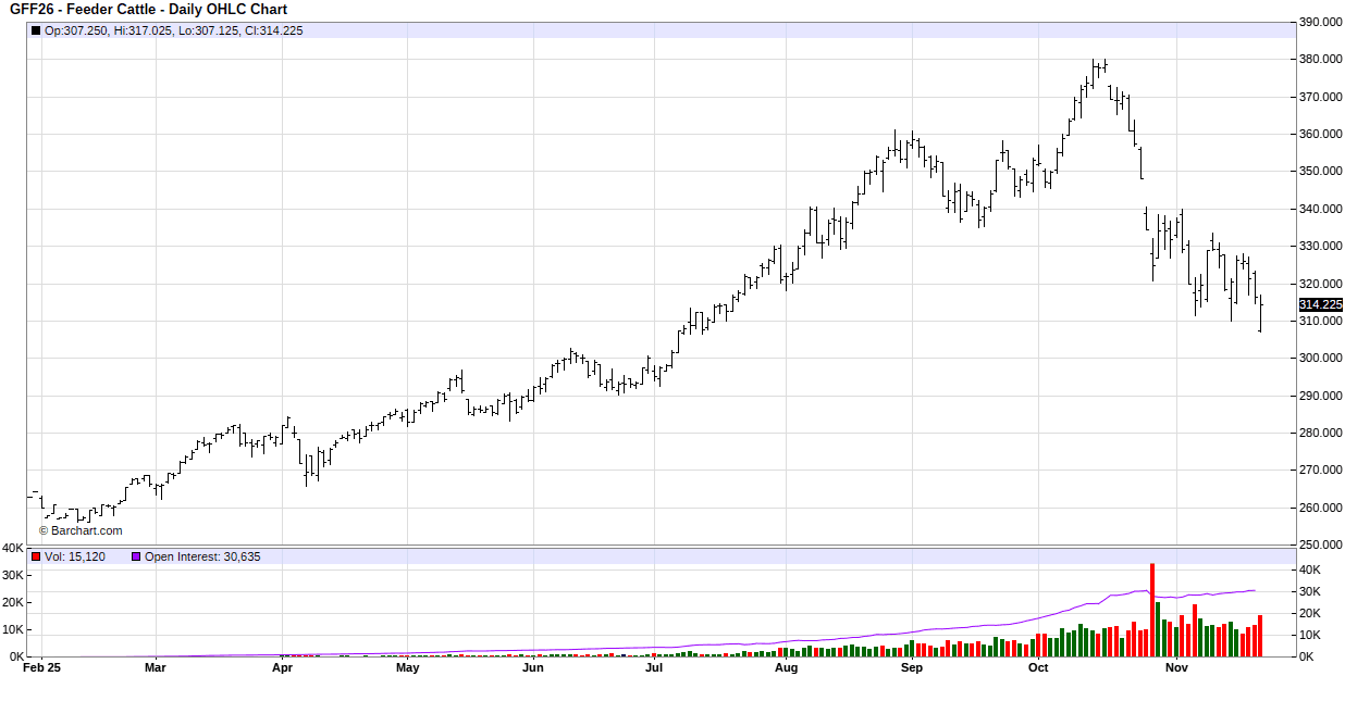 What makes the feeder cattle contract interesting, the Nov contract went off the board at $340.65, the cash feeder cattle index (index of cash trades) is at $340.02, the Jan feeder cattle contract is at $316.375. The way the feeder cattle market looks, the Jan contract is extremely undervalued as it is at a $24.275 discount to the Nov contract.