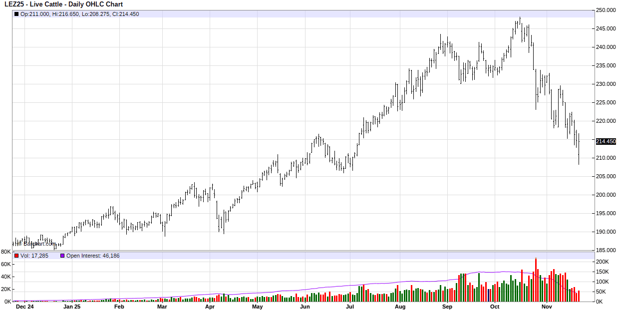 For the week, Dec live cattle closed at $214.45 down $4.70. November feeder cattle expired at $340.65 up $1.975 while the Jan feeder cattle closed at $314.225 down $6.325.
