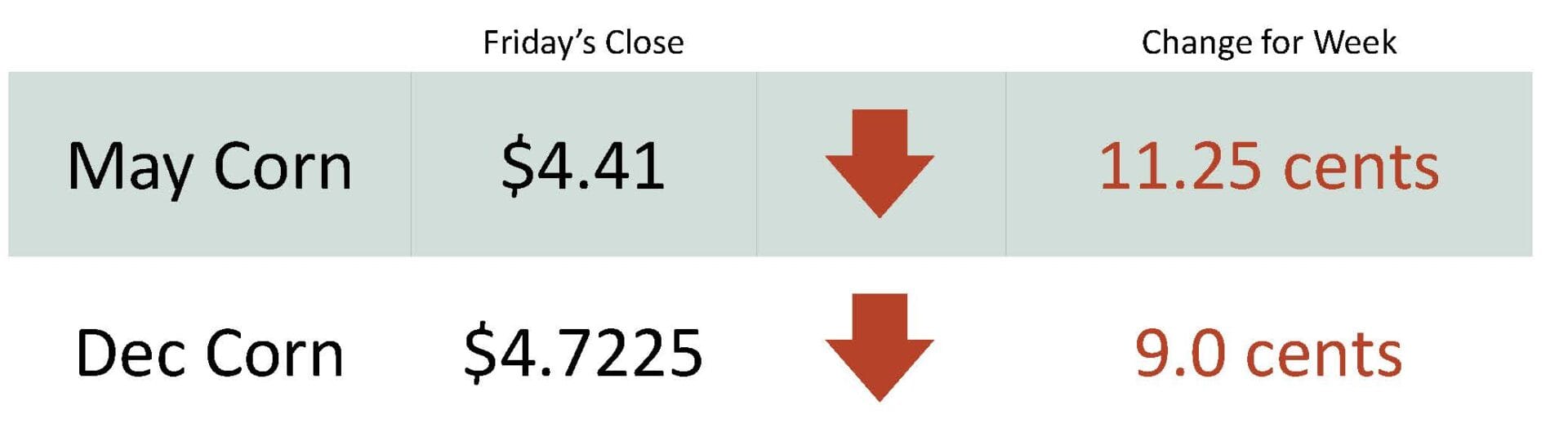 For the week, the close, May corn was at $4.41 down 11.25 cents. Dec corn was at $4.7225 down 9.0 cents.