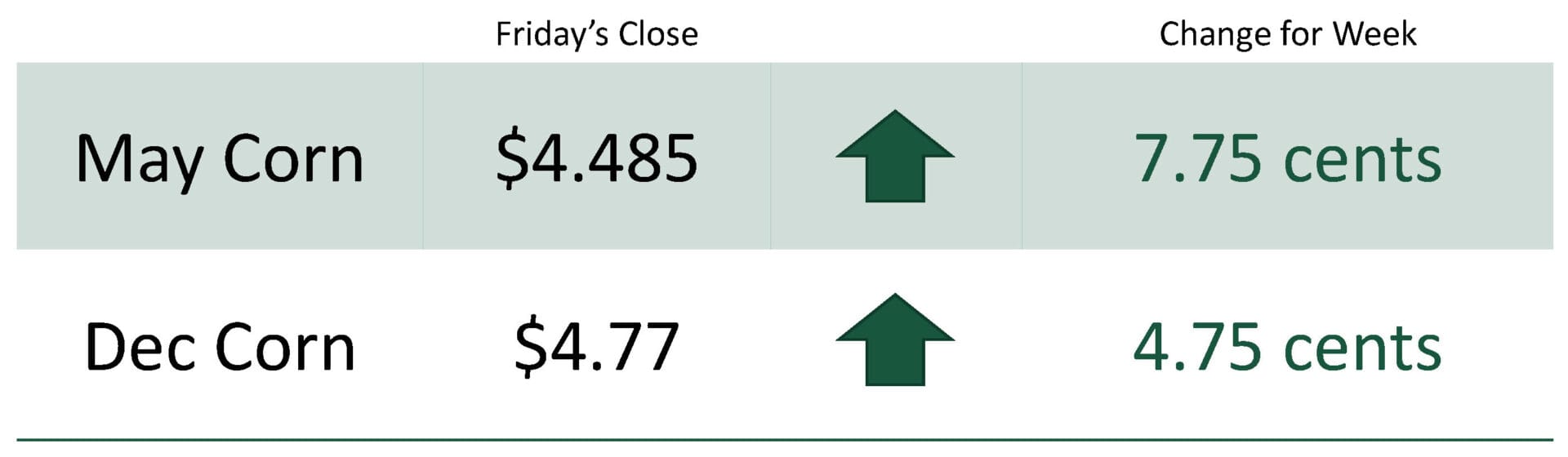 For the week, May corn was at $4.485 up 7.75 cents. Dec corn was at $4.77 up 4.75 cents.