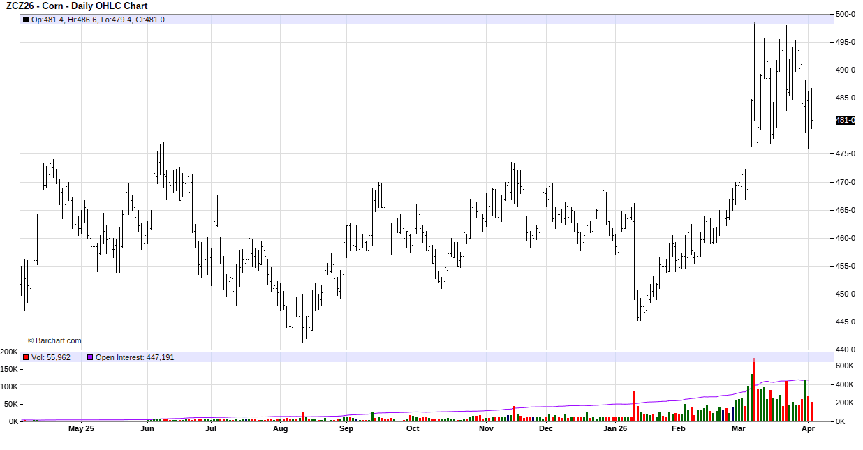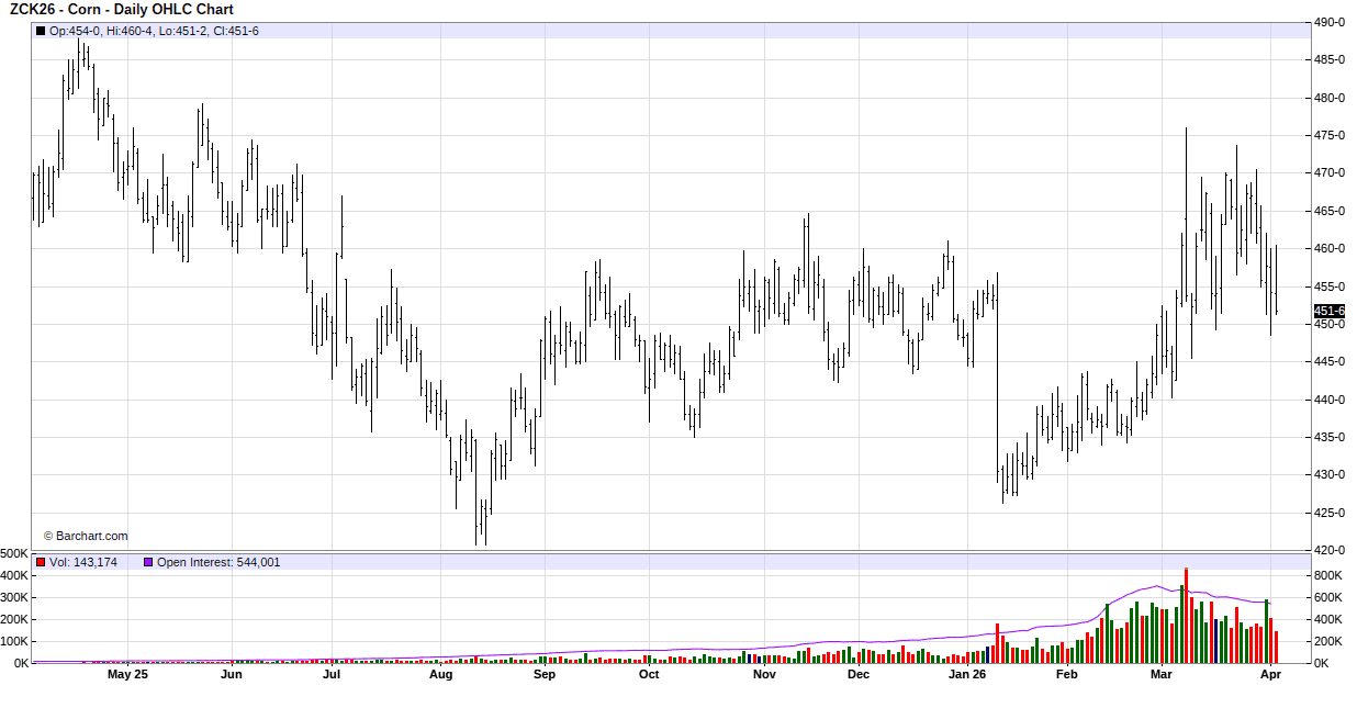 To start the week corn gapped higher at the start of the overnight session and then slowly drifted lower for the rest of the overnight and day session to close with losses. Pressure came from positioning ahead of Tuesday’s report. Private estimates for planted corn acres based on farmer surveys are coming in about 2 million acres higher than the average trade estimate of 94.4 million. Additionally, quarterly grain stocks are expected to be close to 1 billion bushels higher than March 1, 2025, stocks. Traders mostly ignored today’s friendly export demand news. USDA reported a sale of 145,000 MT of corn to an unknown destination and last week’s export sales were above the range of trade expectations and a 4-week high. In South American news, Brazil’s 2nd crop corn planting is at 98% compete vs. 97% average and 1st crop harvest is at 59% complete vs. 59% average.