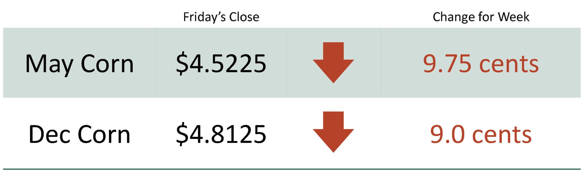 For the week, May corn was at $4.5225 down 9.75 cents. Dec corn was at $4.8125 down 9.0 cents.