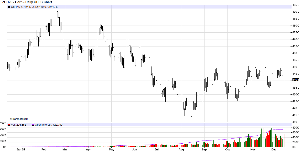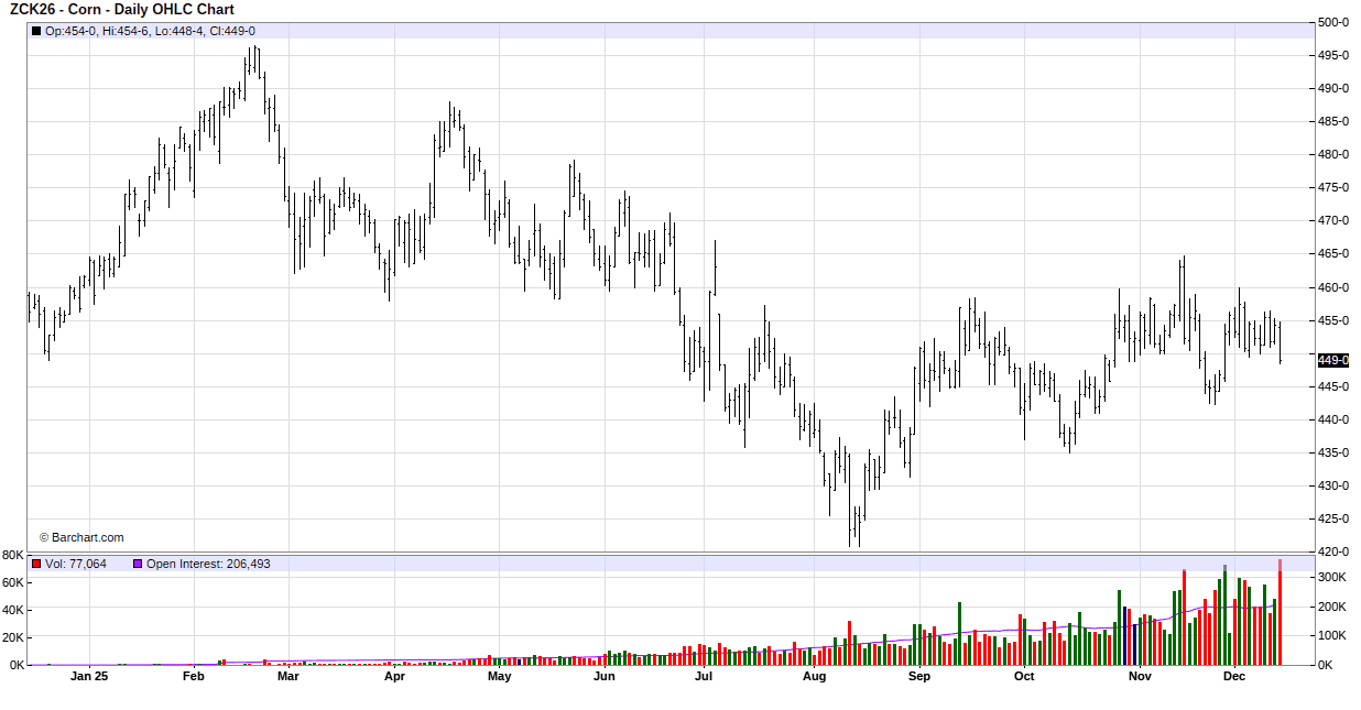 Corn opened Monday’s session steady to firm and traded in that fashion throughout the night and start of the day session. Corn continues to see thin light trading, which was evident by last night’s 2 cent trading range. Early support continues to come from strong demand as last week’s shipments were once again above expectations. Light support was also due to USDA’s 10-year Baseline Projections, which estimates 2026 corn planted acreage at 95 million vs 98.7 million last year. Stocks are estimated at 2.019 BB vs 2.154 BB last year. Support was also due to news that AgRural lowered corn crop production estimate for Brazil to 135.3 MMT vs 141.1 MMT last year. Grains were kept in check by Ukraine’s corn production estimate of 30.5 MMT vs 30.1 MMT previously. As of Dec 5, Brazil estimated their first crop corn planting progress at 97% complete vs 93% last week and 97% average. Traders are not expecting USDA to make much in the way of adjustments to corn’s supply and demand estimate, maybe just a small increase in exports.