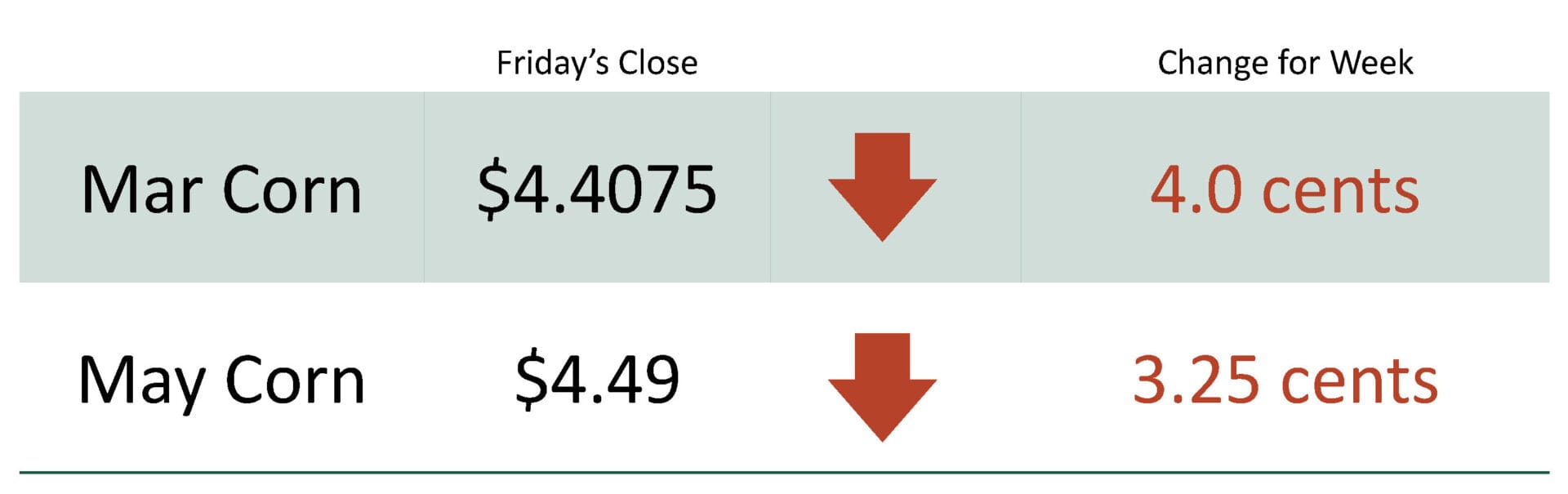 For the week, March corn was at $4.4075 down 4.0 cents. May corn was at $4.49 down 3.25 cents.