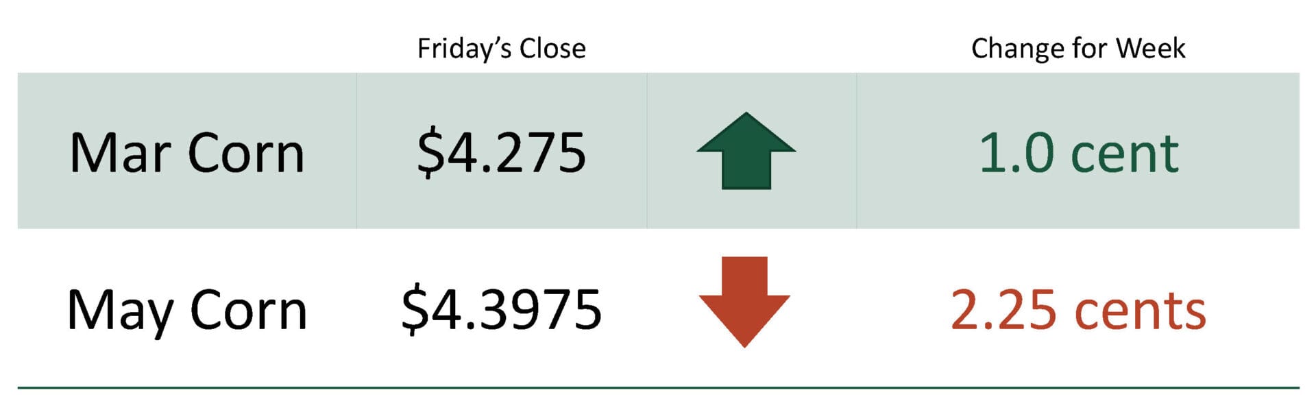 For the week, March corn was at $4.275 up 1.0 cent. May corn was at $4.3975 down 2.25 cents.