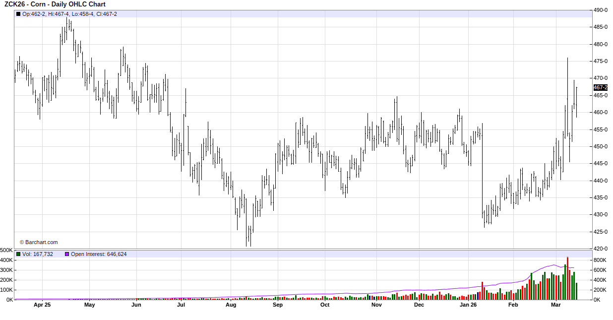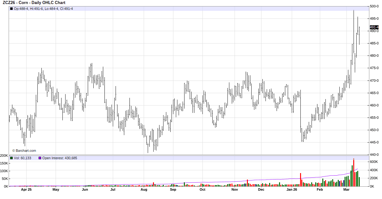Keeping with the trend of the week, corn gapped higher on the opening bell and never looked back. Early support continues to come from the increased tensions from the Iran war. Light support is coming from continued reports of planting delays in Brazil as rain has delayed the harvesting of soybeans and pushed corn planting back enough that over 50% of the second corn crop will be planted after the optimum planting date. Spill over support came from another strong session in the energy sector as well as from a strong soybean complex. Expectations that the recent surge in fertilizer price is resulting in producers backing away from corn added support.