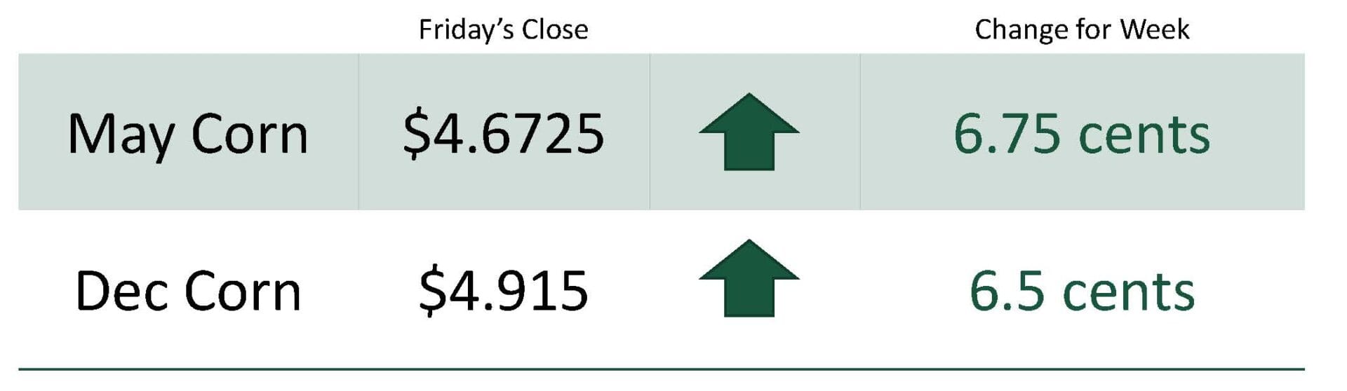 For the week, May corn was at $4.6725 up 6.75 cents. Dec corn was at $4.915 up 6.5 cents.