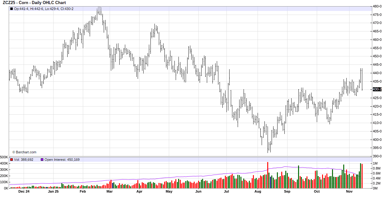 Corn traded in a very tight range just below unchanged overnight but saw gains throughout Thursday’s day session and closed solidly higher. The market is now at levels not seen since late June. Positioning ahead of tomorrow’s report and expectations of strong export demand supported corn. Tomorrow USDA will publish all of the reportable daily export sales that occurred during the shutdown. For the week ending 9/25/25, corn export sales totaled 54.9 MB. USDA will release weekly reports twice a week until caught up. In South American news, CONAB estimates Brazil’s new crop corn production at 138.8 MMT, slightly lower than last year’s production of 141.1 MMT.