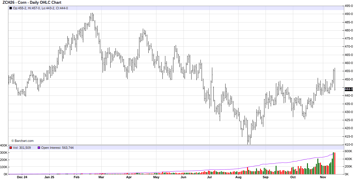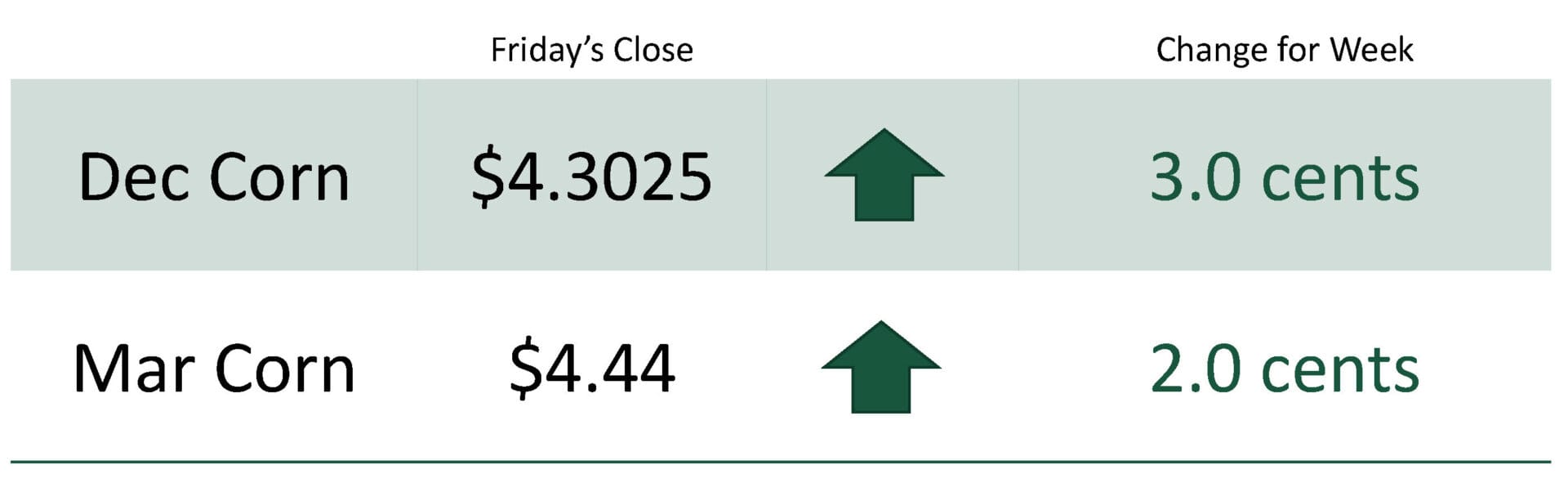 For the week, Dec corn was at $4.3025 up 3.0 cents. Mar corn was at $4.44 up 2.0 cents.