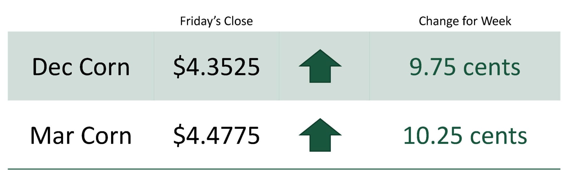 For the week, Dec corn was at $4.3525 up 9.75 cents. Mar corn was at $4.4775 up 10.25 cents.