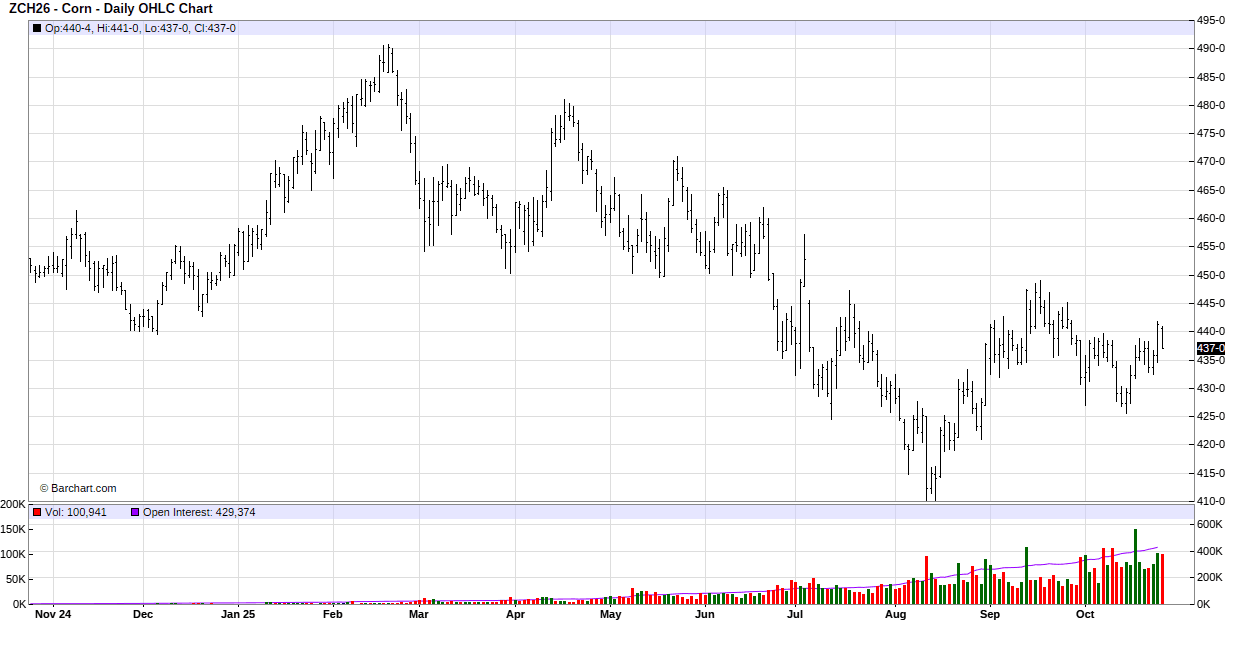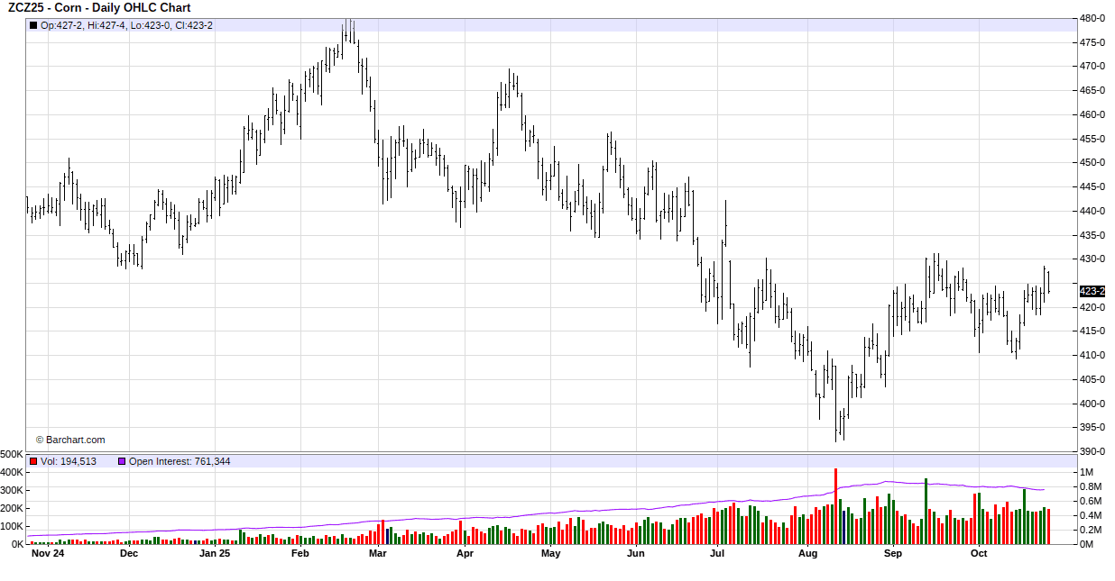Corn opened steady on Thursday but managed to recover and push higher to post gains by the end of the night session. Early support came from expectations of strong export demand as although the export sales report is not being released due to the government shutdown, estimates are still projecting strong corn sales. New sanction on 2 Russian crude oil companies added support to corn. Confirmation that Trump and Xi will meet on October 30 added support. Talk of good yields, but not USDA estimated good, added support. At this point, it appears that the US corn crop will be another record, but estimates are closer to a 182 bu. yield than USDA’s 186.7 bu. yield.