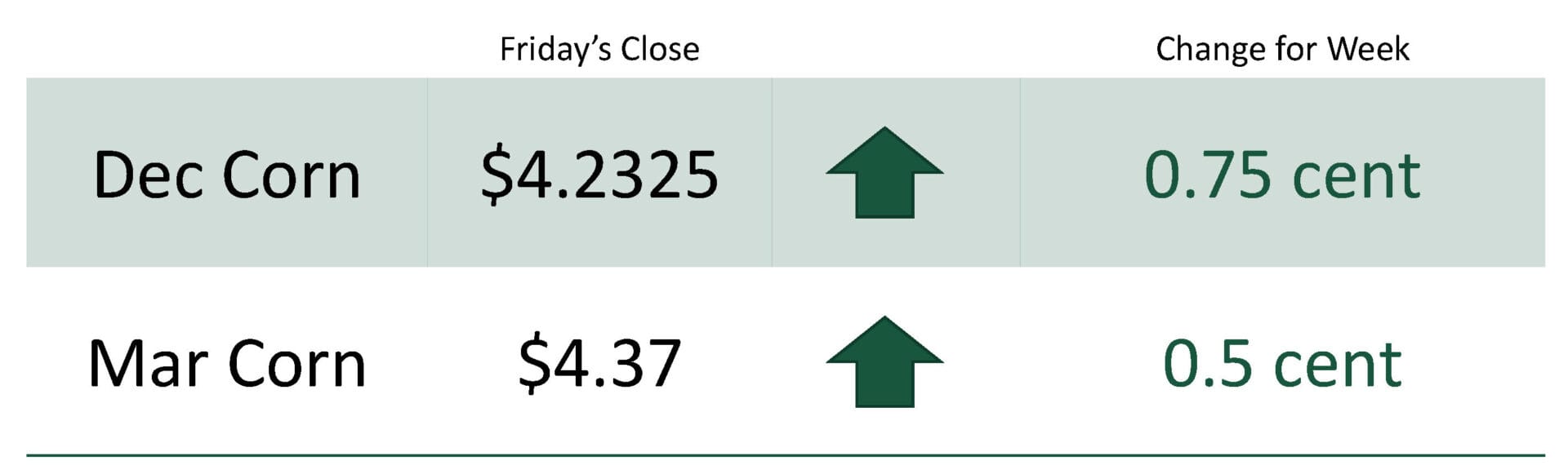For the week, Dec corn was at $4.2325 up 0.75 cent. Mar corn was at $4.37 up 0.5 cent.