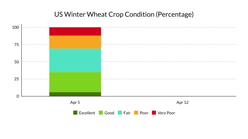 As of April 5, 7% of the nation’s winter wheat was headed vs. 5% last year and 5% average. Winter wheat’s crop condition rating came in at 35% g/e, 34% fair and 31% p/vp, quite a bit lower than last year’s 48% g/e and the average trade estimate of 42% g/e. By state, CO was 12% g/e, KS was 38% g/e, OK was 12% g/e and TX was 17% g/e.