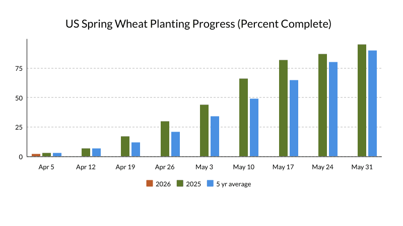 As of April 5, 2% of the nation’s spring wheat was planted vs. 3% last year and 3% average. SD is 4% planted vs. 7% average, ND is at 0% vs. 1% average, and MN is at 0% vs. 1% average.