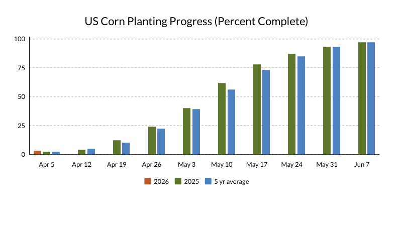 As of April 5, 3% of the nation’s corn was planted vs. 2% last year and 2% average.