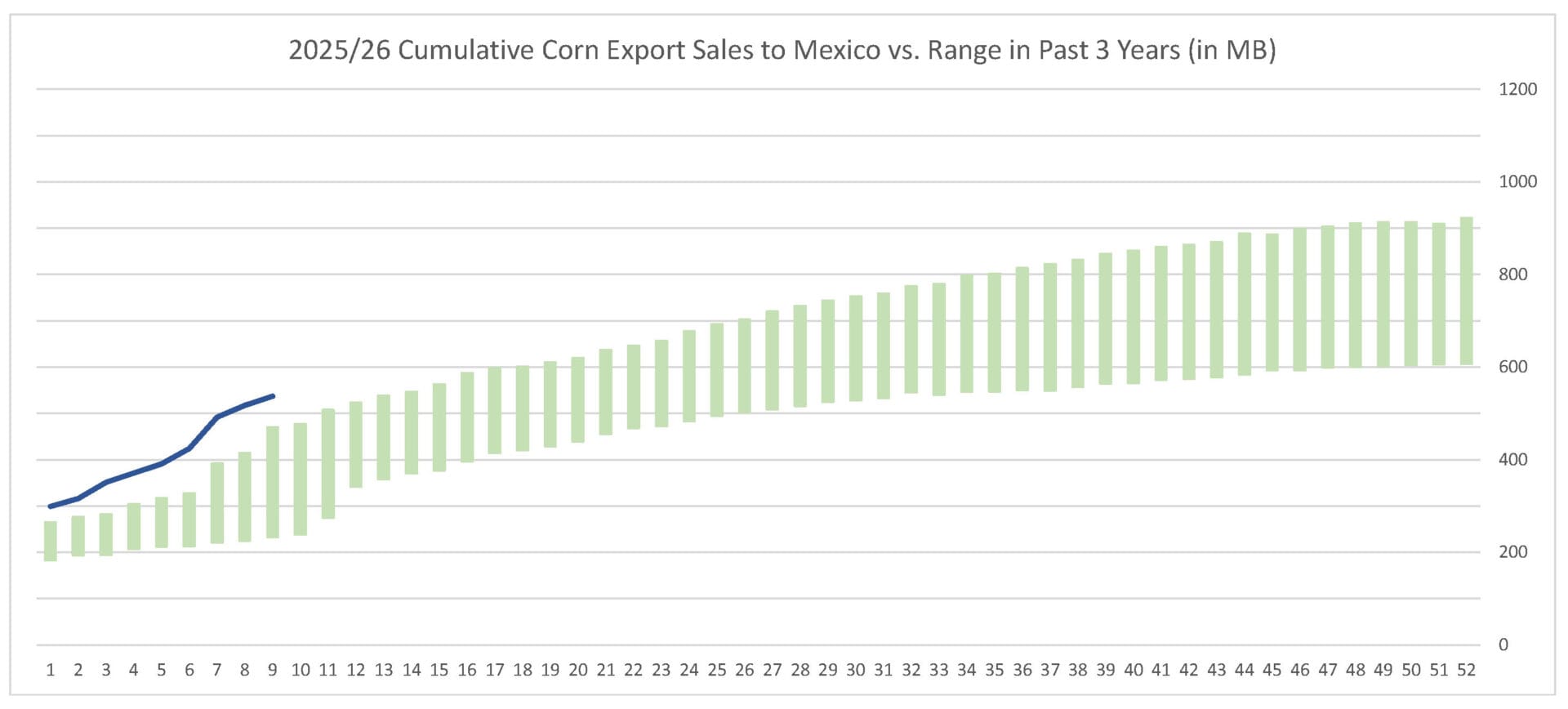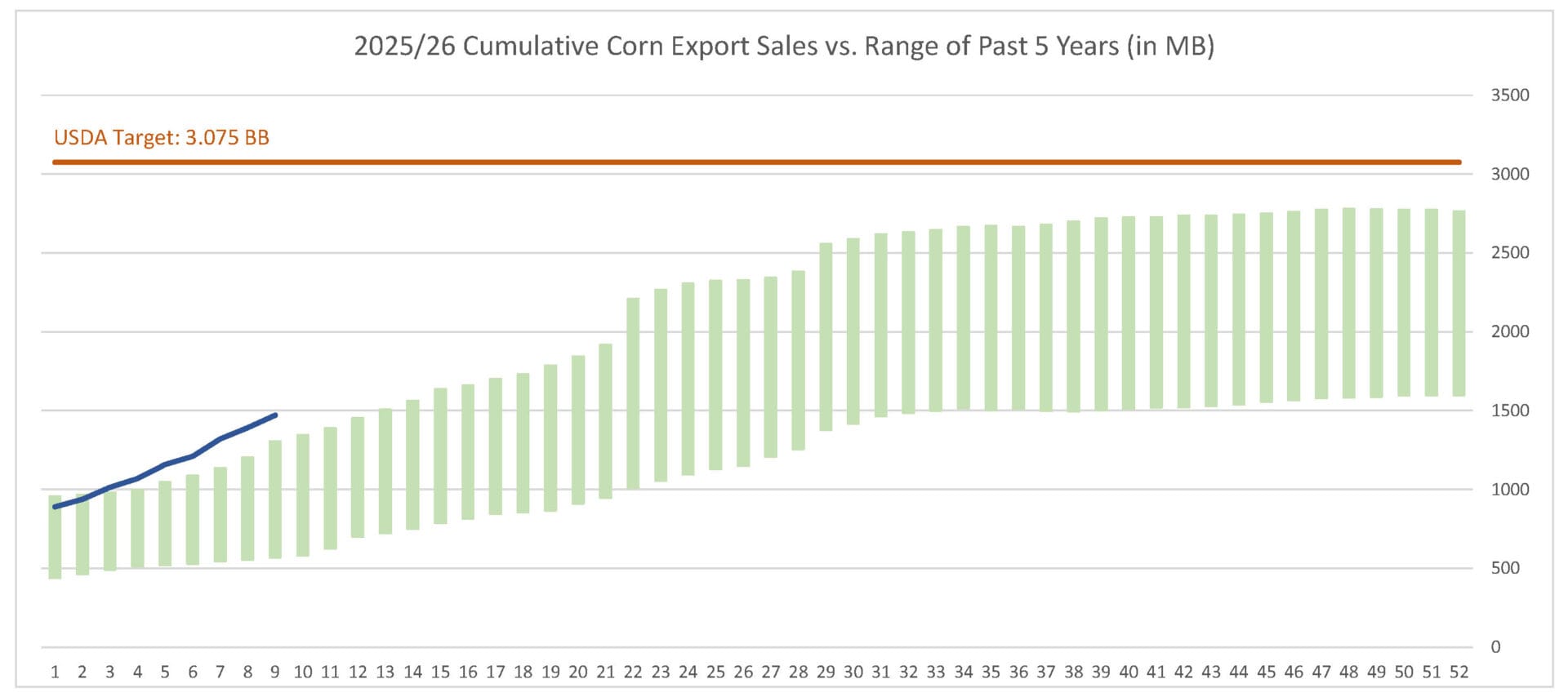 For the week ending 10/30/25, corn’s export sales pace was estimated at 78.5 MB. After 9 weeks, corn sales were at 49% of USDA’s expectations vs. 40% last year. With 43 weeks left in corn’s export marketing year, sales need to average 35.0 MB to make USDA’s projection of 3.075 BB.