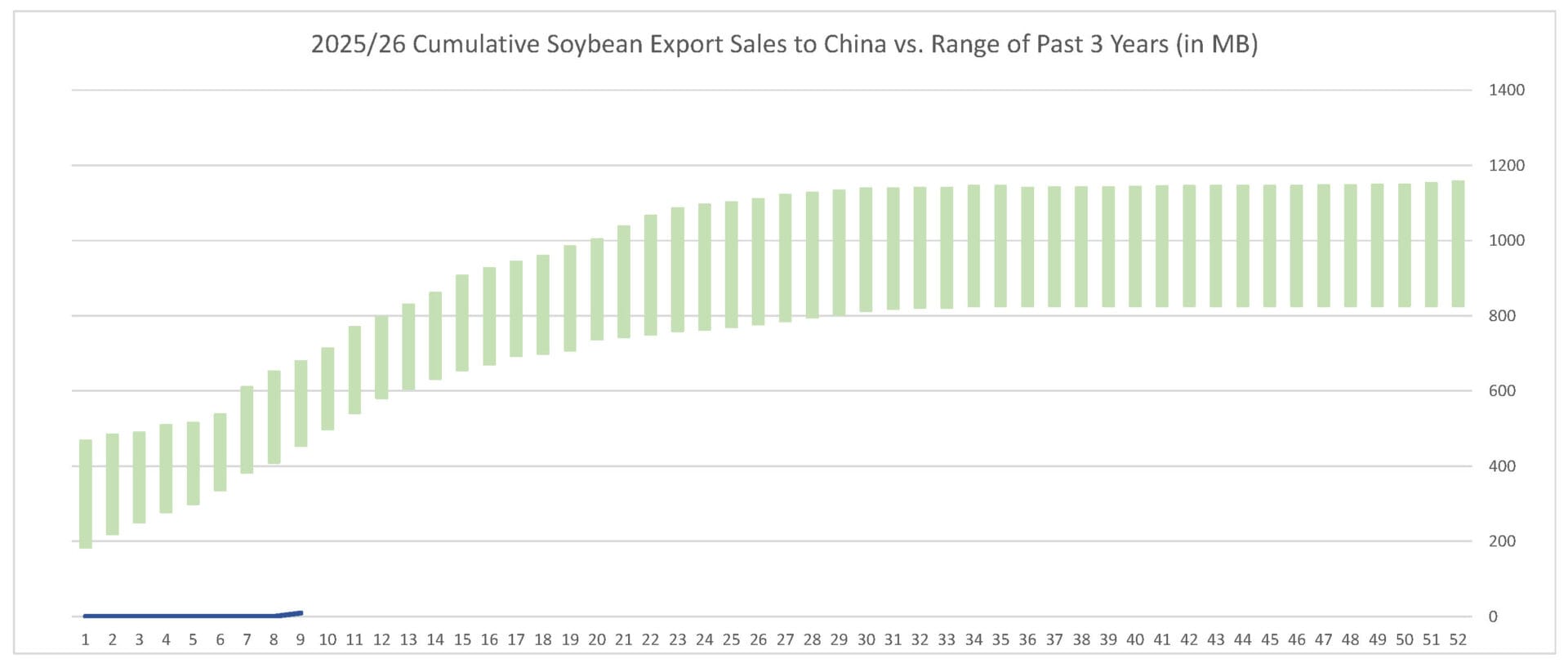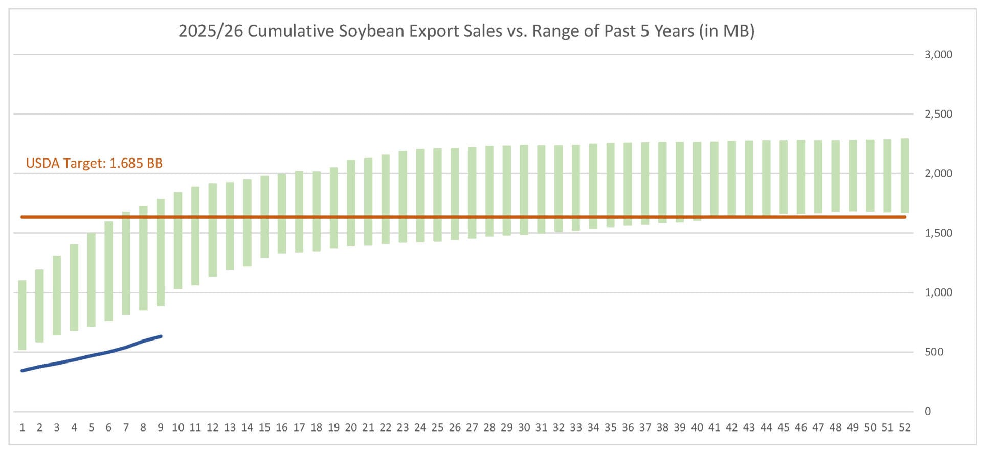 For the week ending 10/30/25, soybeans’ export sales pace was estimated at 45.9 MB. After 9 weeks, soybean sales were at 38% of USDA’s expectations vs. 55% last year. With 43 weeks left in soybeans’ export marketing year, sales need to average 24.5 MB to make USDA’s projection of 1.635 BB.