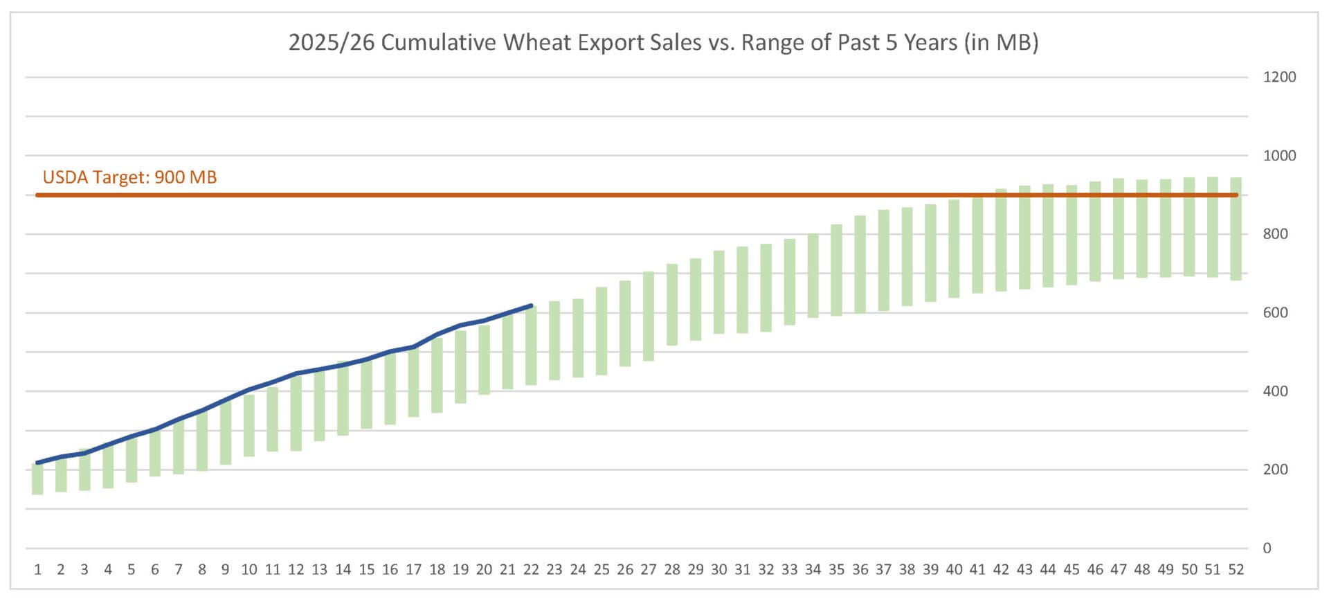 For the week ending 10/30/25, wheat’s export sales pace was estimated at 18.6 MB. After 22 weeks, wheat sales were at 69% of USDA’s expectations vs. 61% last year. With 30 weeks left in wheat’s export marketing year, sales need to average 9.4 MB to make USDA’s projection of 900 MB.