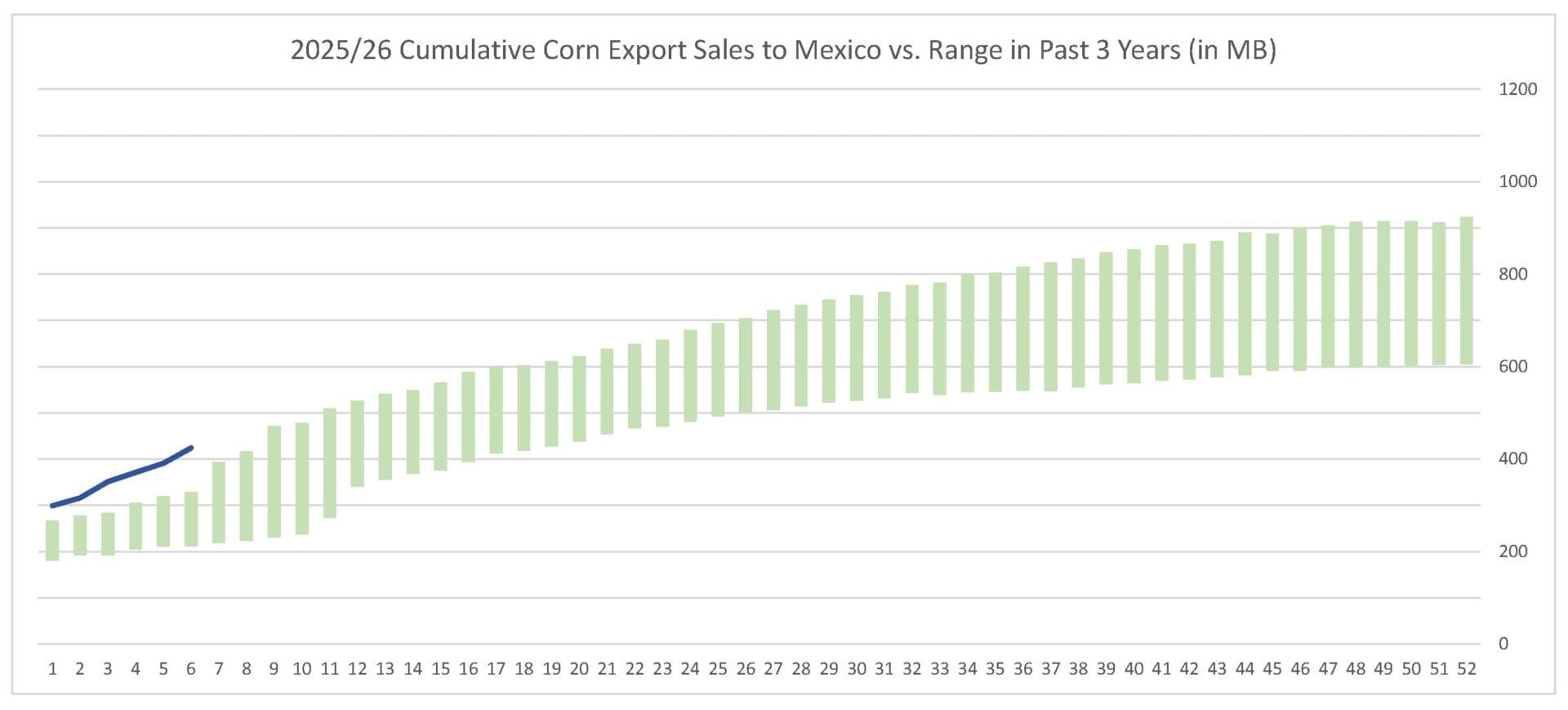 For the week ending 10/9/25, corn’s export sales pace was estimated at 52.2 MB. After 6 weeks, corn sales were at 41% of USDA’s expectations vs. 28% last year. With 46 weeks left in corn’s export marketing year, sales need to average 38.4 MB to make USDA’s projection of 3.075 BB.