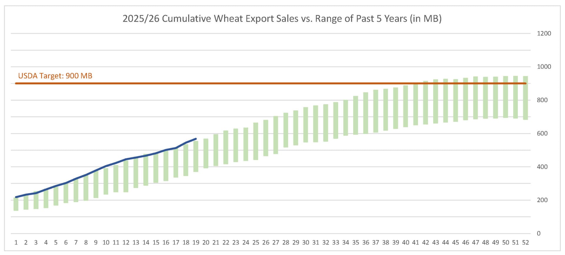 For the week ending 10/9/25, wheat’s export sales pace was estimated at 22.6 MB. After 19 weeks, wheat sales were at 63% of USDA’s expectations vs. 55% last year. With 33 weeks left in wheat’s export marketing year, sales need to average 10.1 MB to make USDA’s projection of 900 MB.
