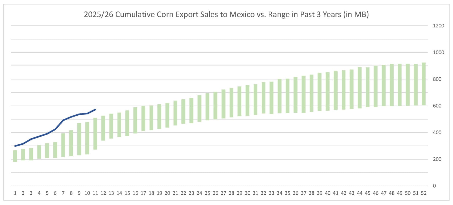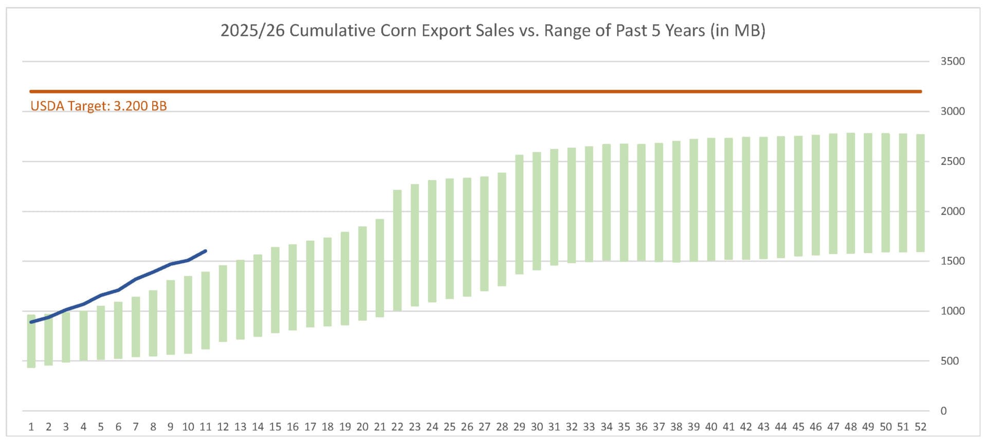 For the week ending 11/13/25, corn’s export sales pace was estimated at 93.7 MB. After 11 weeks, corn sales were at 54% of USDA’s expectations vs. 44% last year. With 41 weeks left in corn’s export marketing year, sales need to average 33.5 MB to make USDA’s projection of 3.075 BB.