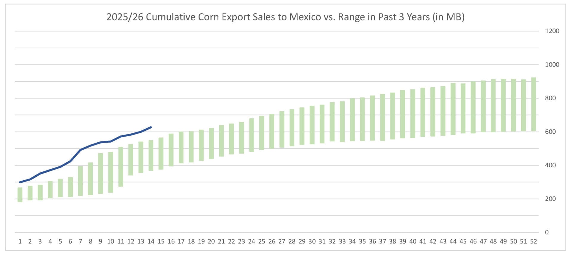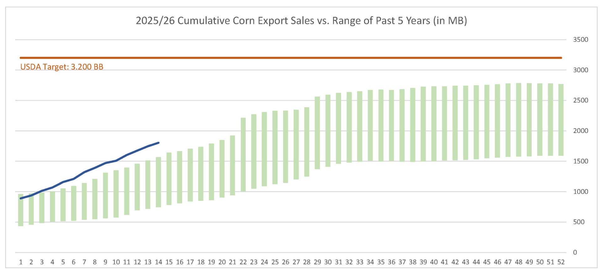 For the week ending 12/4/25, corn’s export sales pace was estimated at 58.2 MB. After 14 weeks, corn sales were at 59% of USDA’s expectations vs. 48% last year. With 38 weeks left in corn’s export marketing year, sales need to average 33.4 MB to make USDA’s projection of 3.075 BB.