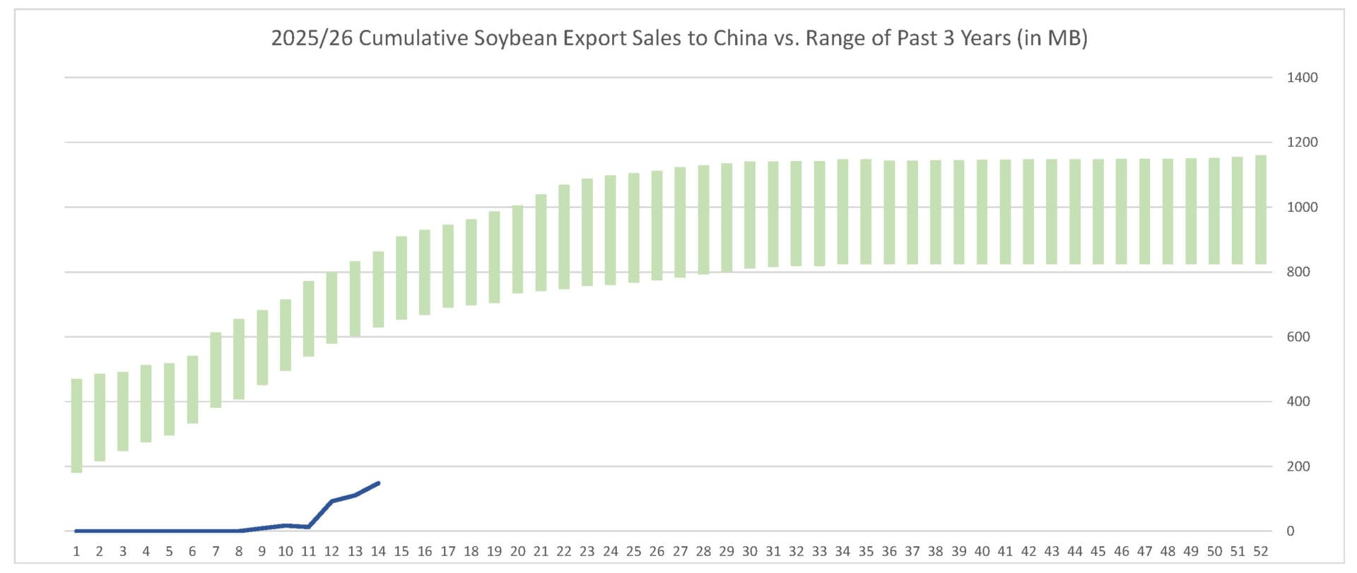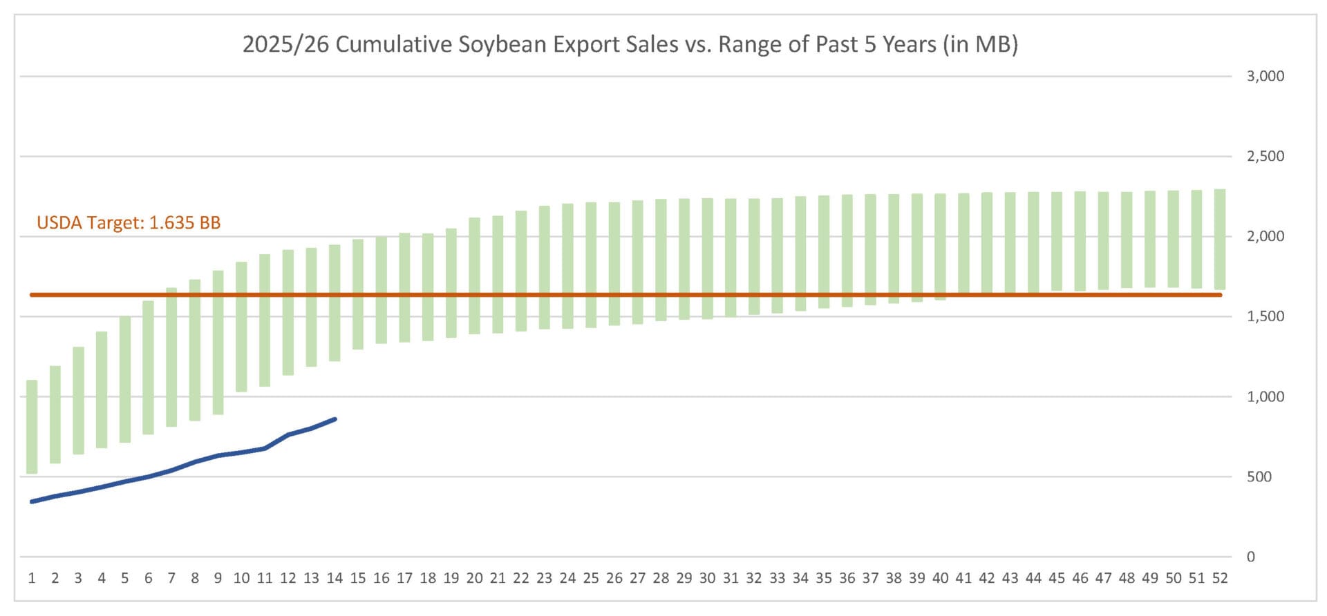 For the week ending 12/4/25, soybeans’ export sales pace was estimated at 57.0 MB. After 14 weeks, soybean sales were at 53% of USDA’s expectations vs. 73% last year. With 38 weeks left in soybeans’ export marketing year, sales need to average 20.4 MB to make USDA’s projection of 1.635 BB.