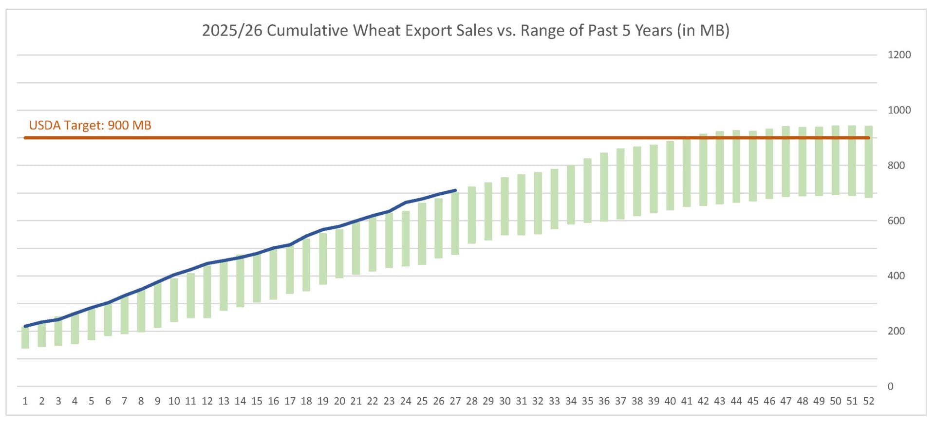 For the week ending 12/4/25, wheat’s export sales pace was estimated at 14.0 MB. After 27 weeks, wheat sales were at 79% of USDA’s expectations vs. 70% last year. With 25 weeks left in wheat’s export marketing year, sales need to average 7.6 MB to make USDA’s projection of 900 MB.
