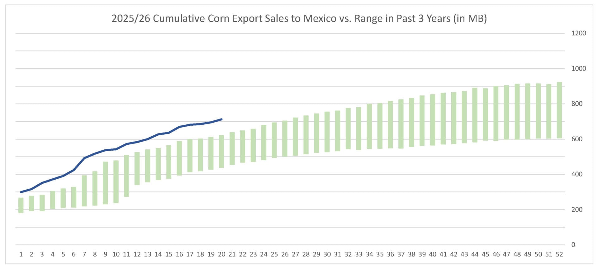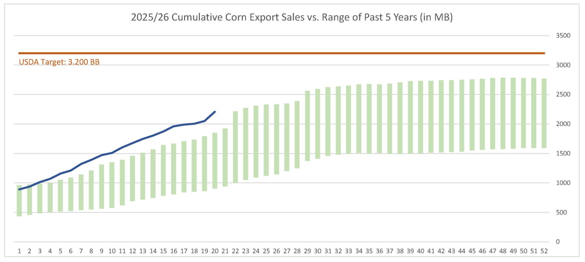 Last week’s corn export sales pace was estimated at 157.9 MB. After 20 weeks, corn sales were at 69% of USDA’s expectations vs. 58% last year. With 32 weeks left in corn’s export marketing year, sales need to average 31.0 MB to make USDA’s projection of 3.200 BB.