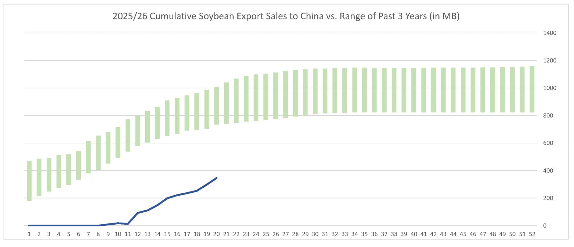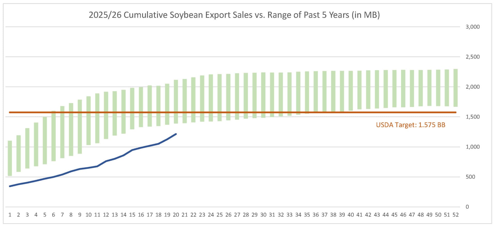 Last week’s soybean export sales pace was estimated at 89.9 MB. After 20 weeks, soybean sales were at 77% of USDA’s expectations vs. 82% last year. With 32 weeks left in soybeans’ export marketing year, sales need to average 11.3 MB to make USDA’s projection of 1.575 BB.