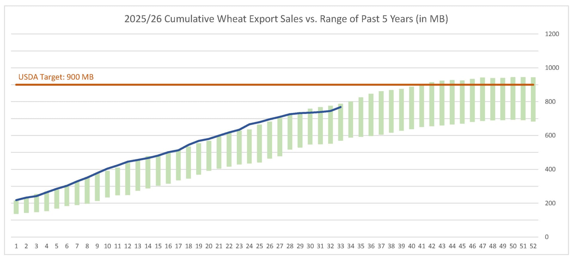 Last week’s wheat export sales pace was estimated at 22.7 MB. After 33 weeks, wheat sales were at 85% of USDA’s expectations vs. 79% last year. With 19 weeks left in wheat’s export marketing year, sales need to average 7.0 MB to make USDA’s projection of 900 MB.