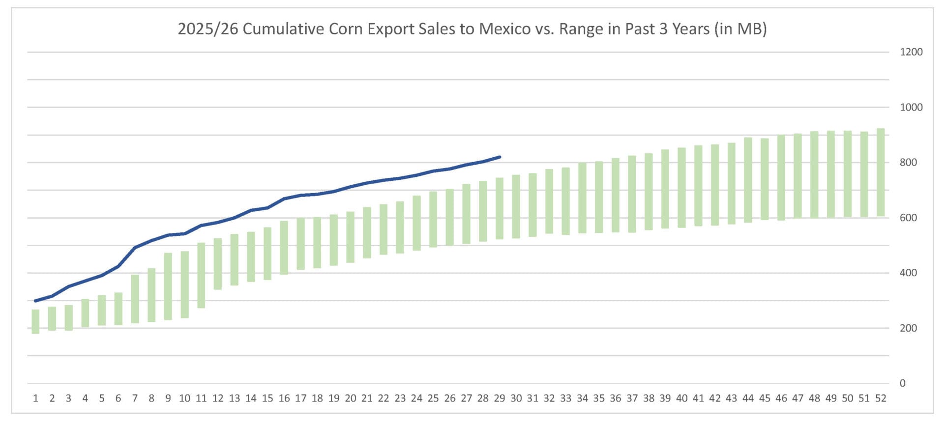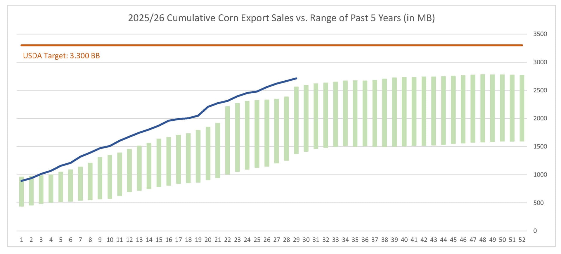 Last week’s corn export sales pace was estimated at 47.9 MB. After 29 weeks, corn sales were at 82% of USDA’s expectations vs. 73% last year. With 23 weeks left in corn’s export marketing year, sales need to average 25.5 MB to make USDA’s projection of 3.300 BB.