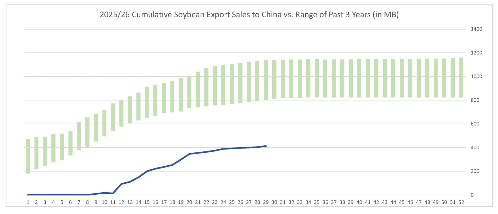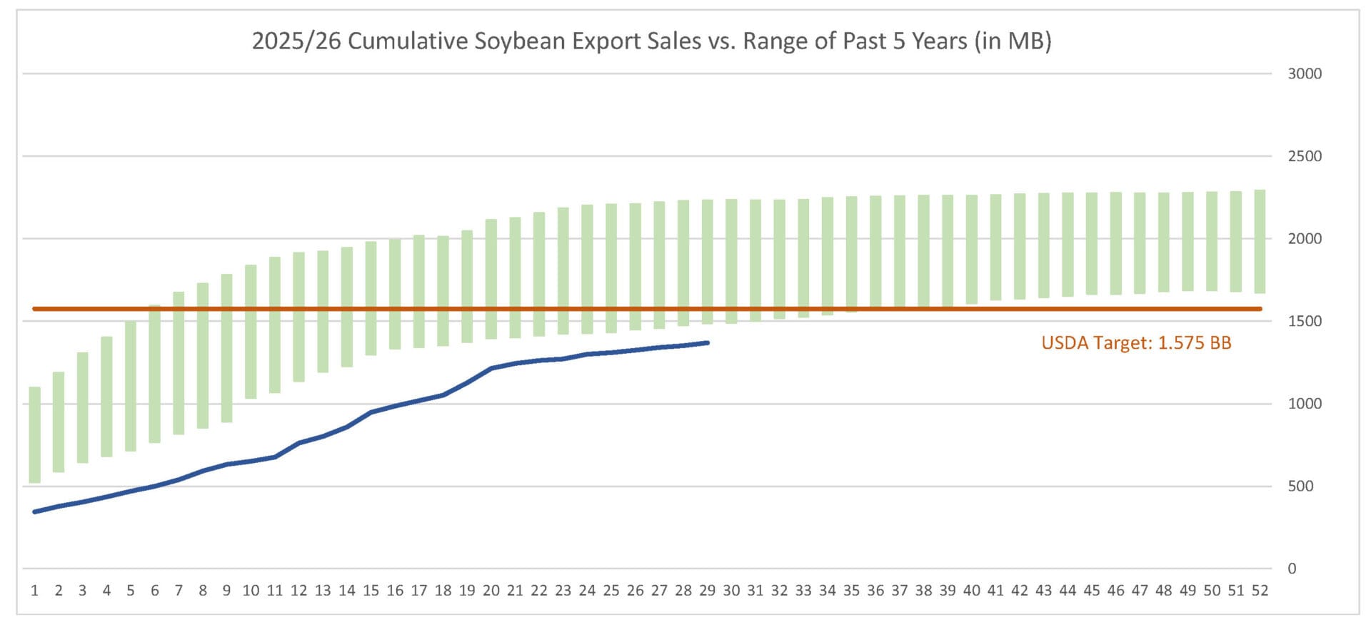 Last week’s soybean export sales pace was estimated at 24.6 MB. After 29 weeks, soybean sales were at 87% of USDA’s expectations vs. 89% last year. With 23 weeks left in soybeans’ export marketing year, sales need to average 8.9 MB to make USDA’s projection of 1.575 BB.