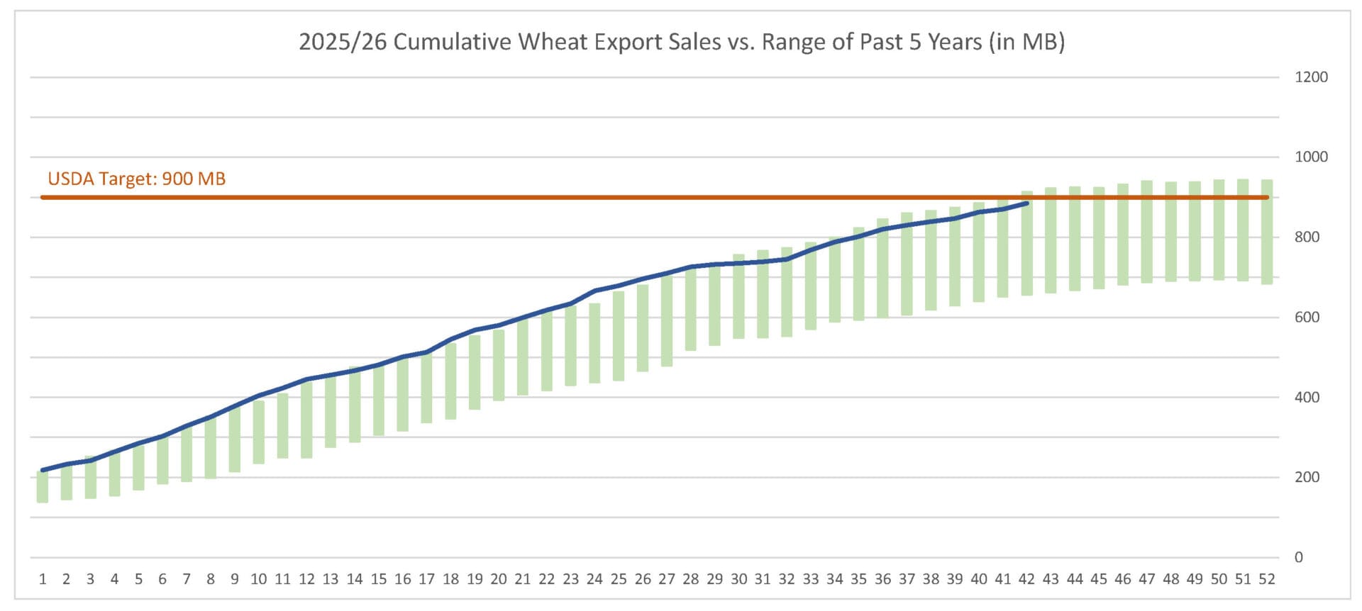 Last week’s wheat export sales pace was estimated at 14.6 MB. After 42 weeks, wheat sales were at 98% of USDA’s expectations vs. 93% last year. With 10 weeks left in wheat’s export marketing year, sales need to average 1.5 MB to make USDA’s projection of 900 MB.