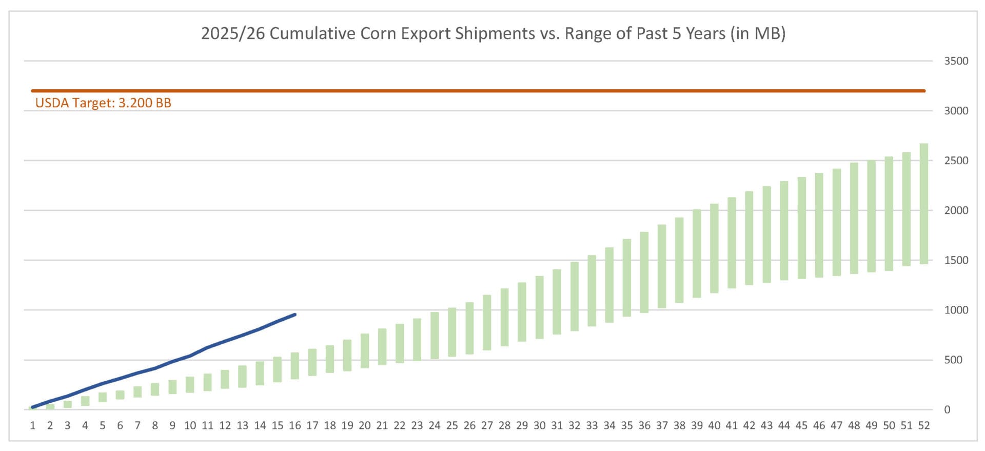 Last week’s corn export shipments pace was estimated at 68.7 MB. After 16 weeks, corn shipments were at 30% of USDA’s expectations vs. 20% last year. With 36 weeks left in corn’s export marketing year, shipments need to average 62.4 MB to make USDA’s projection of 3.200 BB.