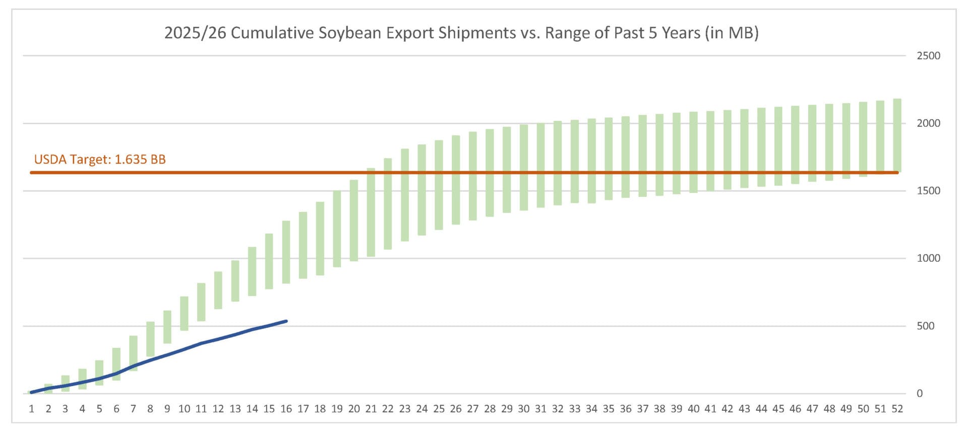 Last week’s soybean export shipments pace was estimated at 32.0 MB. After 16 weeks, soybean shipments were at 33% of USDA’s expectations vs. 53% last year. With 36 weeks left in soybeans’ export marketing year, shipments need to average 30.5 MB to make USDA’s projection of 1.635 BB.