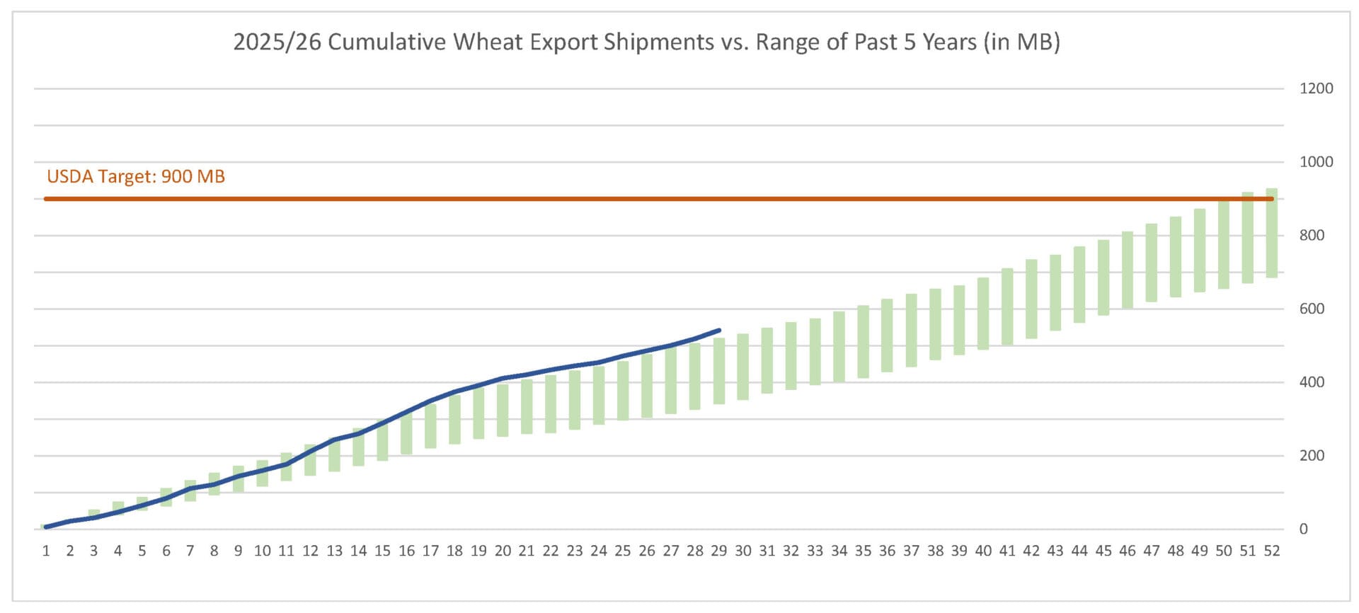 Last week’s wheat export shipments pace was estimated at 23.1 MB. After 29 weeks, wheat shipments were at 60% of USDA’s expectations vs. 53% last year. With 23 weeks left in wheat’s export marketing year, shipments need to average 15.6 MB to make USDA’s projection of 900 MB.