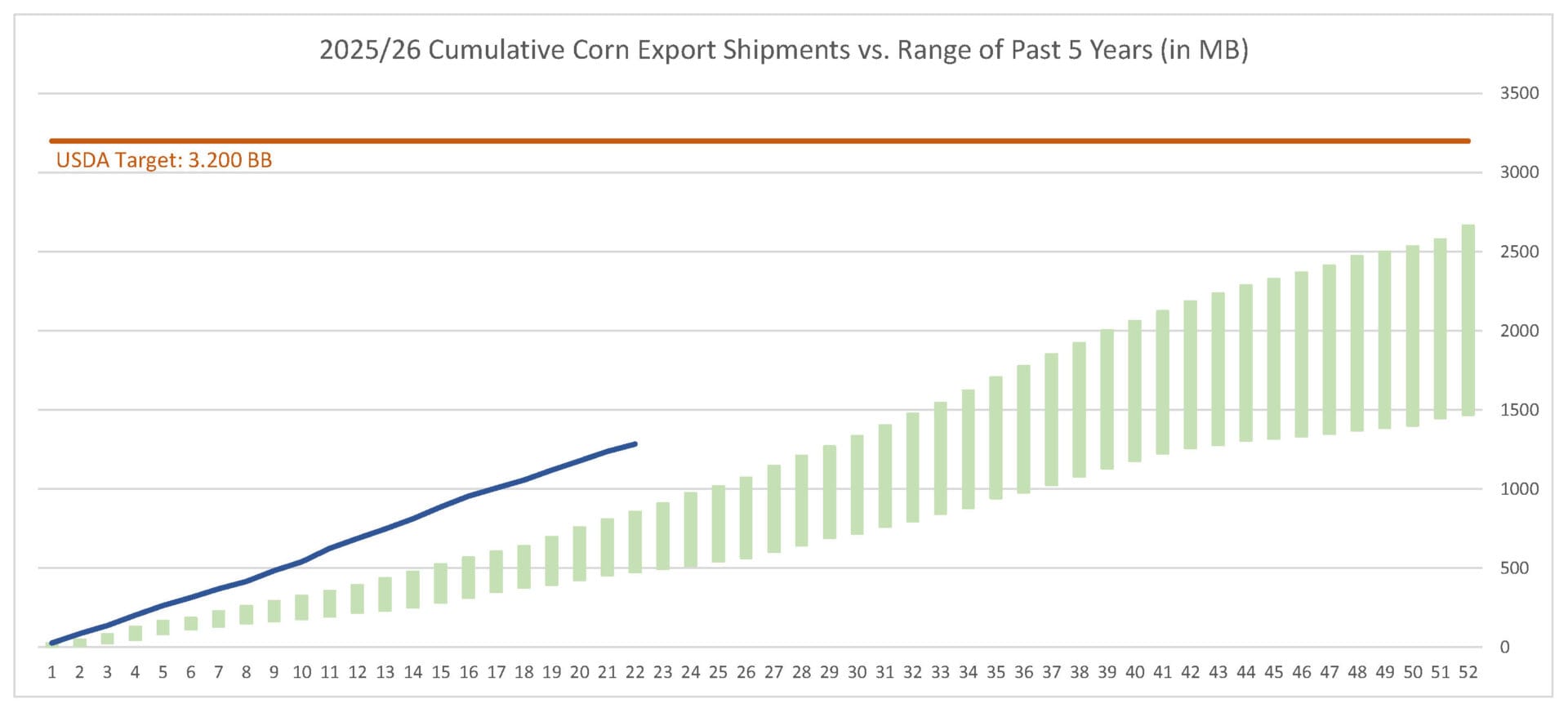 Last week’s corn export shipments pace was estimated at 44.7 MB. After 22 weeks, corn shipments were at 40% of USDA’s expectations vs. 30% last year. With 30 weeks left in corn’s export marketing year, shipments need to average 63.9 MB to make USDA’s projection of 3.200 BB.