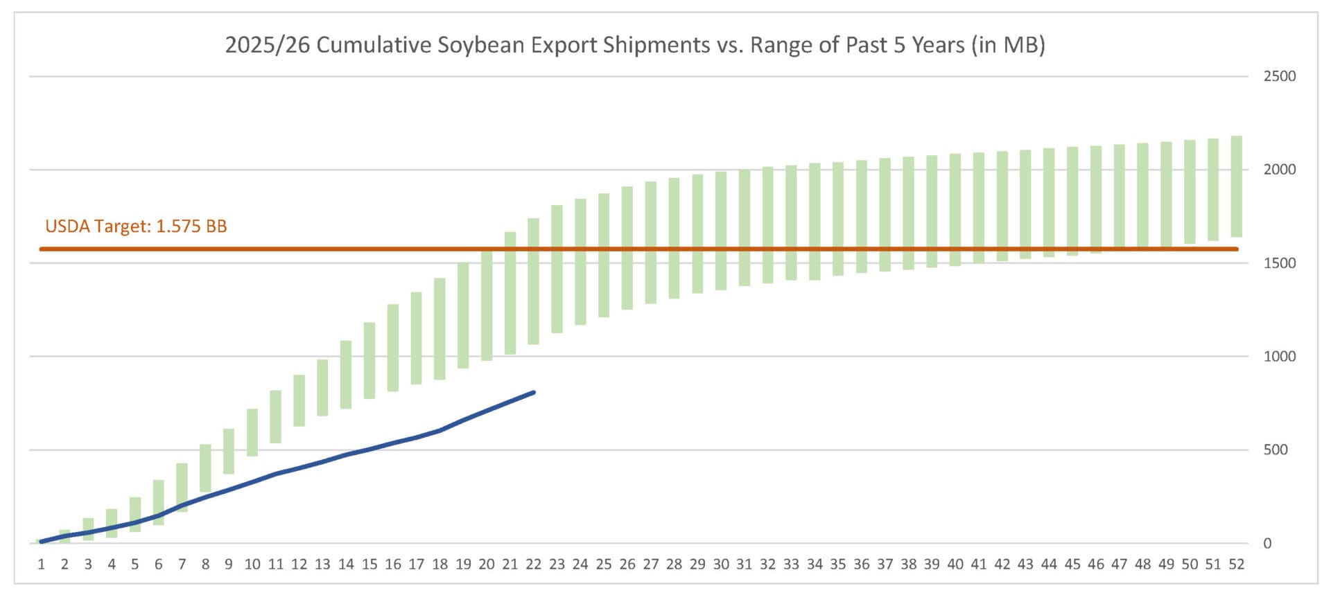 Last week’s soybean export shipments pace was estimated at 48.2 MB. After 22 weeks, soybean shipments were at 51% of USDA’s expectations vs. 67% last year. With 30 weeks left in soybeans’ export marketing year, shipments need to average 25.6 MB to make USDA’s projection of 1.575 BB.