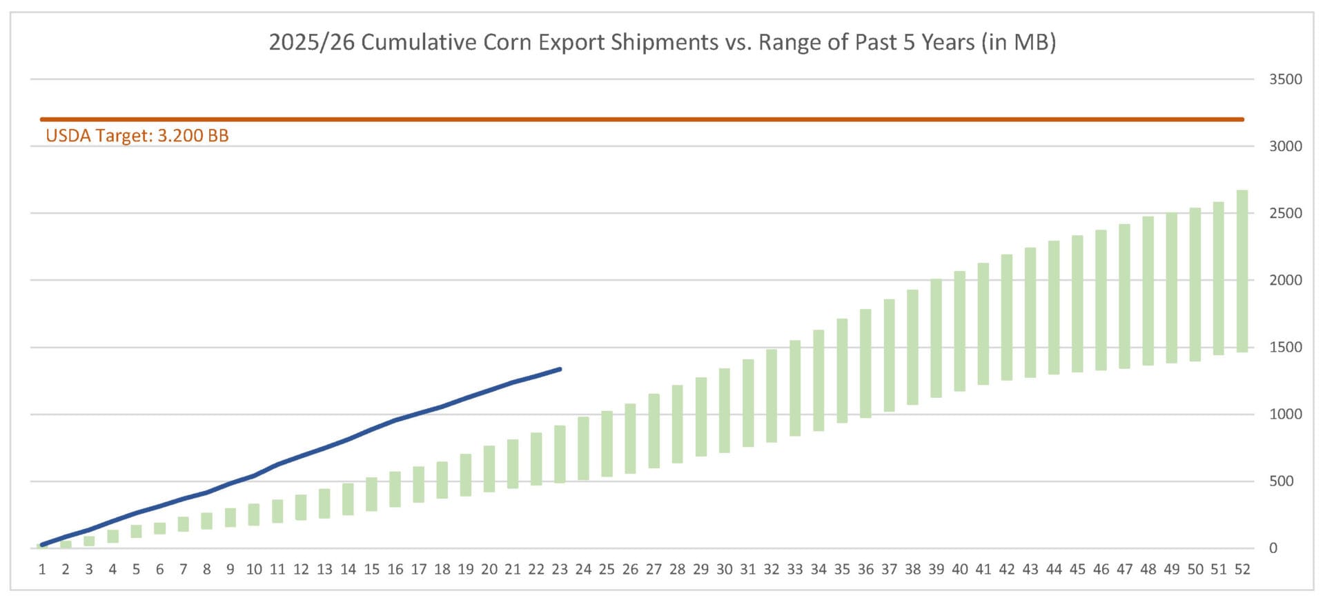 Last week’s corn export shipments pace was estimated at 51.5 MB. After 23 weeks, corn shipments were at 42% of USDA’s expectations vs. 32% last year. With 29 weeks left in corn’s export marketing year, shipments need to average 64.3 MB to make USDA’s projection of 3.200 BB.